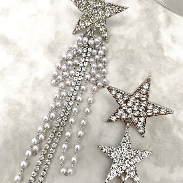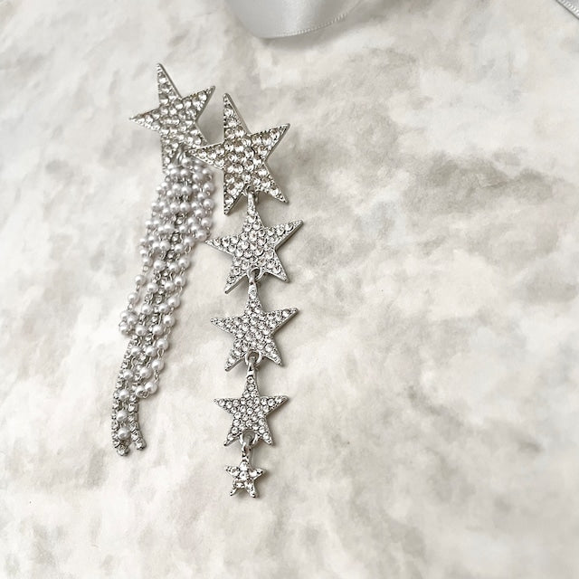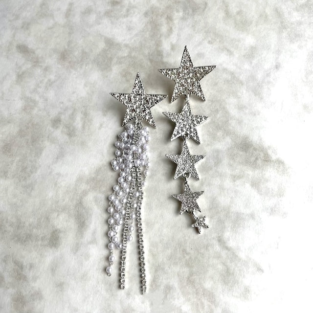 5個の星が連なったピアスと、もう一つは流れ星を連想させるような…星とチェーンパールの商品です。