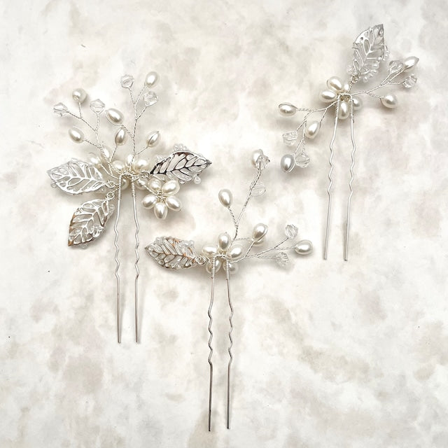 パールやビーズを使用した優しい雰囲気のピン3本セットです。