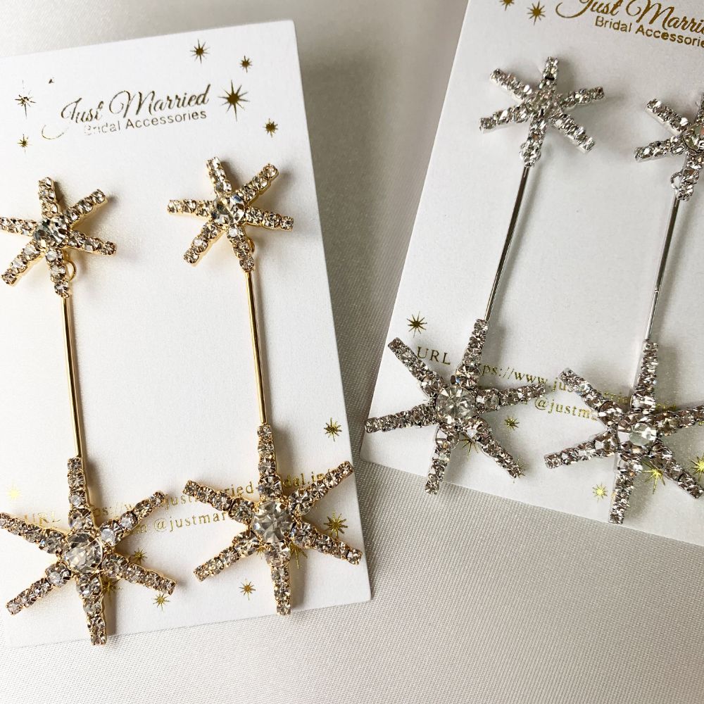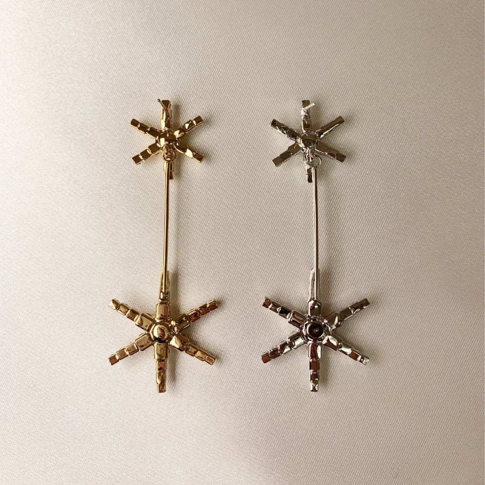 下の部分の大振りのスターモチーフが、顔を動かすたびに、ゆらゆらと揺れて輝くデザインです。
