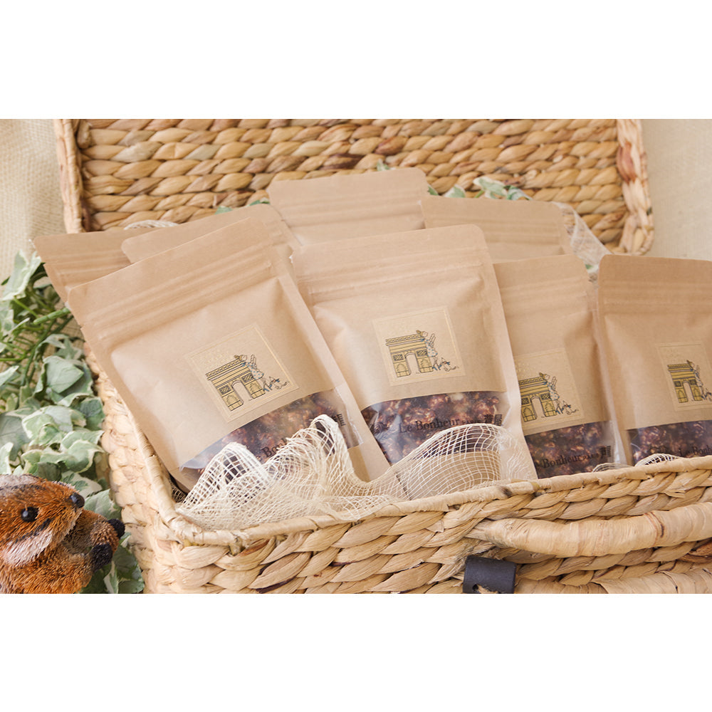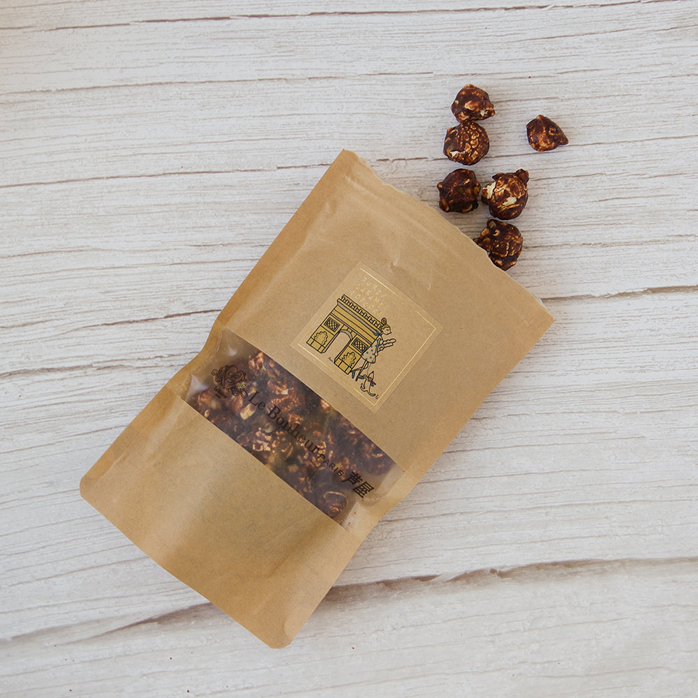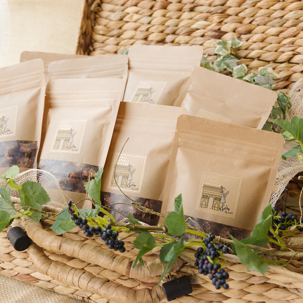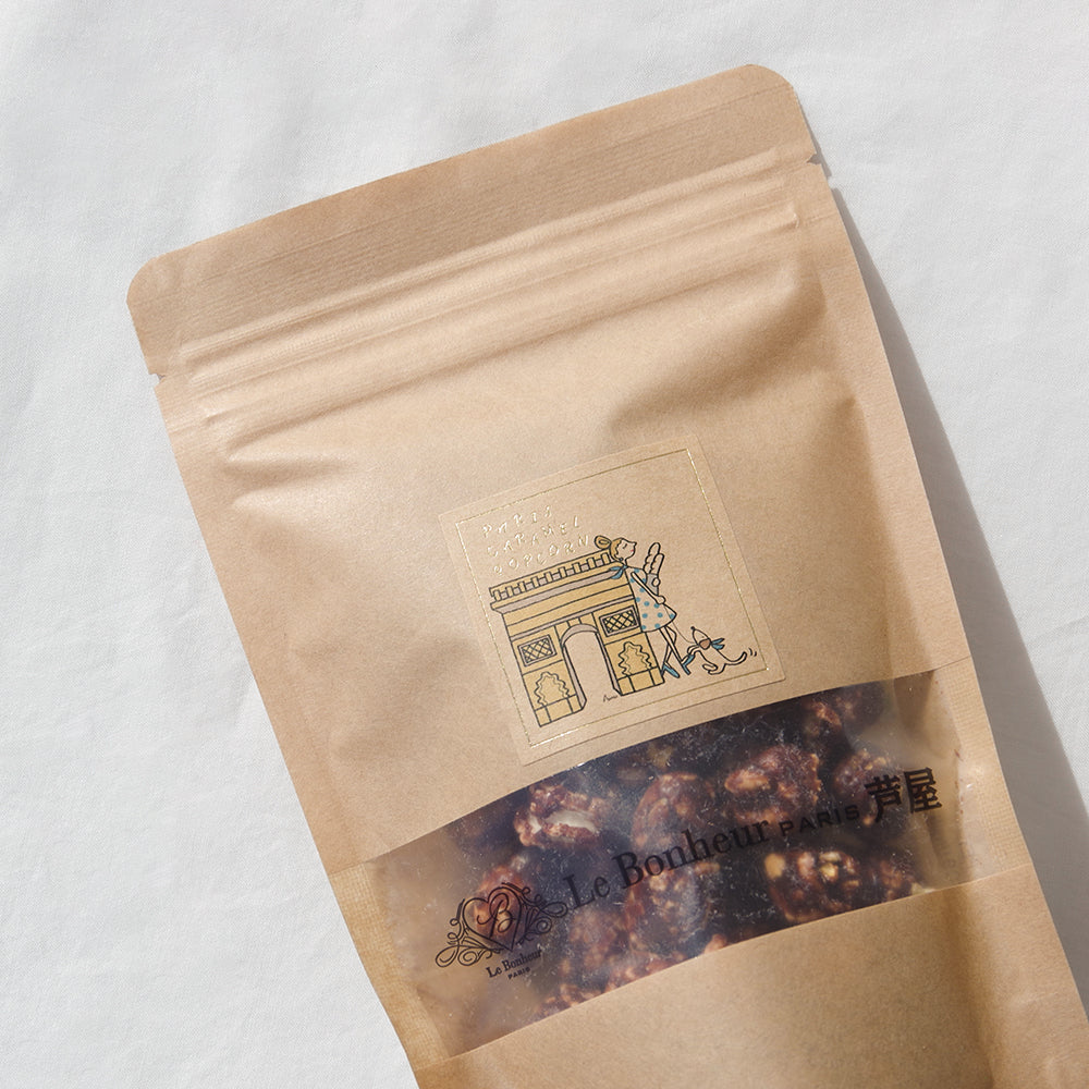 商品を開けるとショコラの甘い香りと落花生の芳ばしい匂いが広がります。 ショコラに落花生をトッピングしていることにより、一口食べると癖のある味わいをお楽しみいただけます。