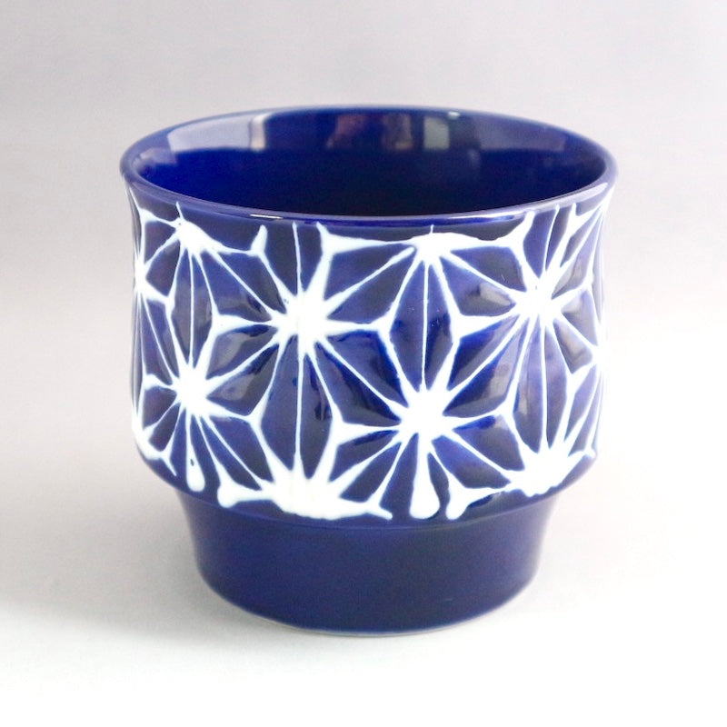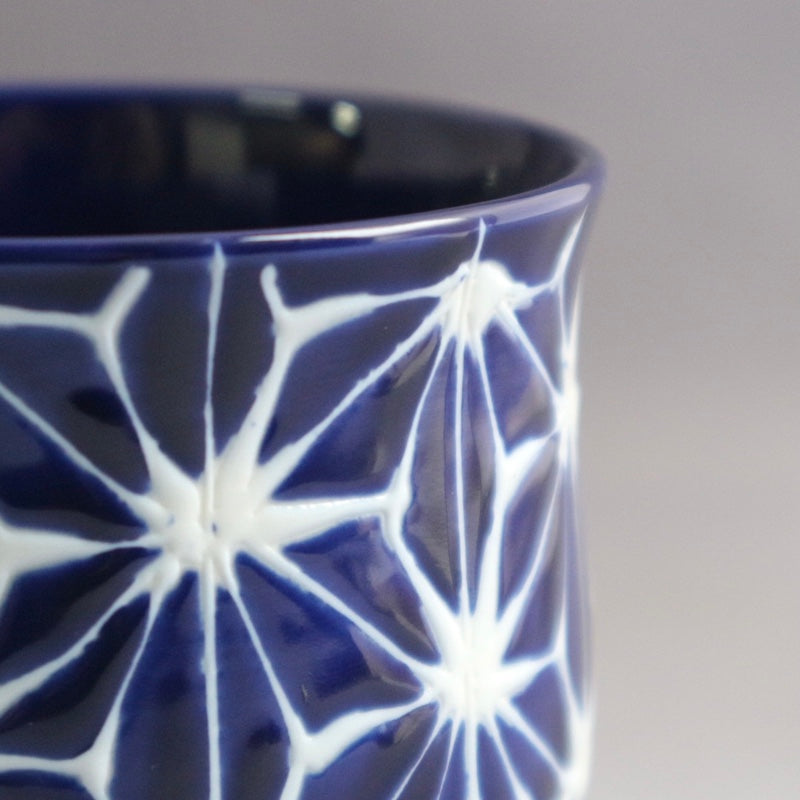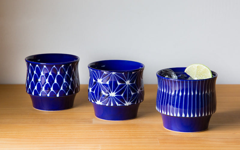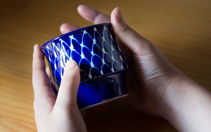 瑠璃釉を基調に白イッチンで一筆一筆描かれた贅沢な器は、江戸切子のような伝統的意匠をイメージさせる。柄は「麻の葉」「雨垂れ」「網絵」の3種類。