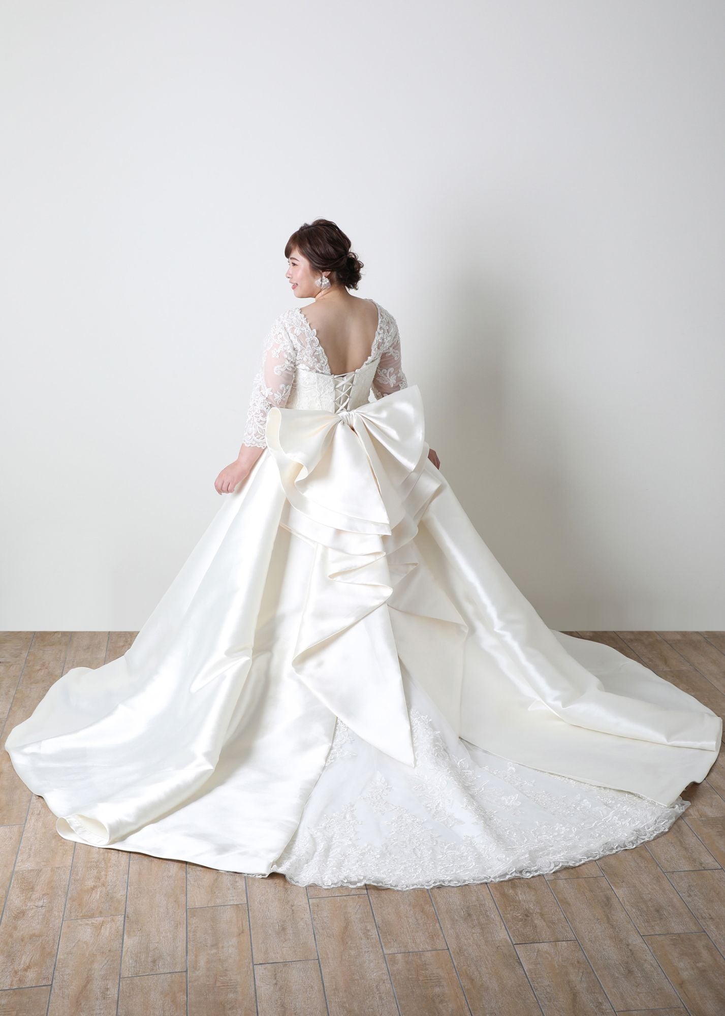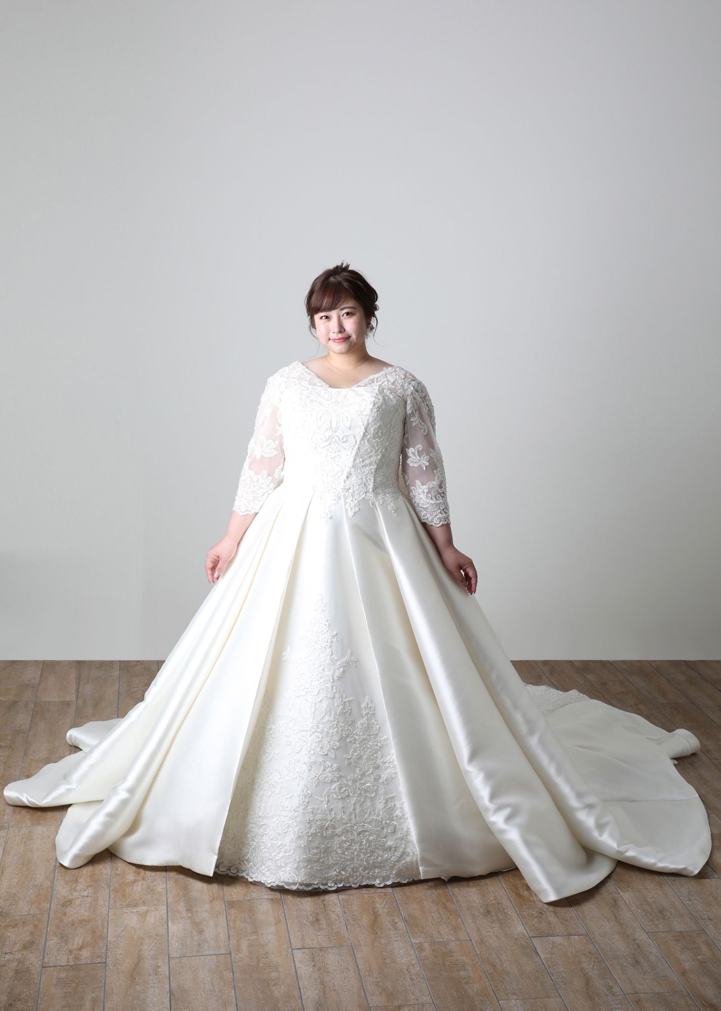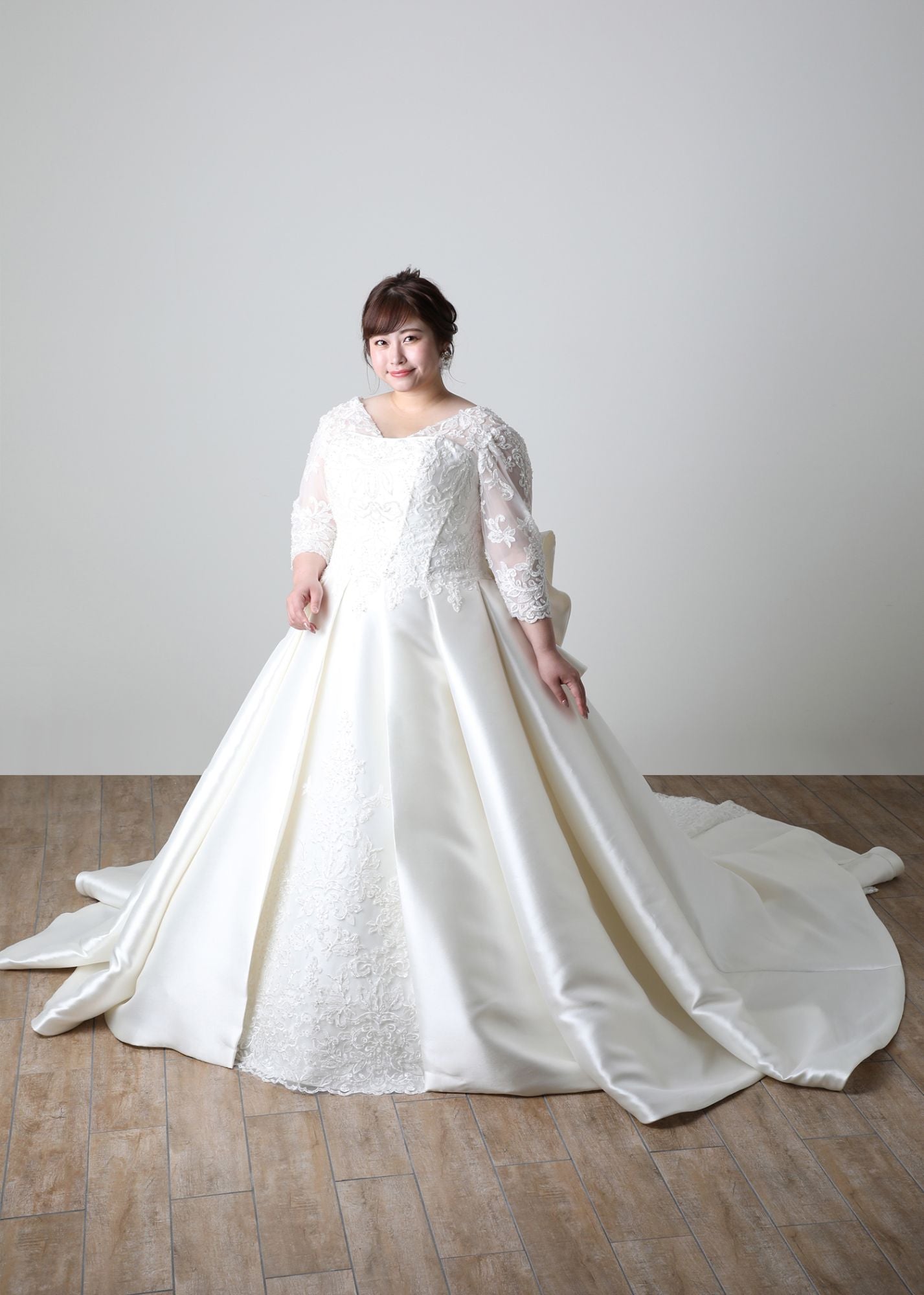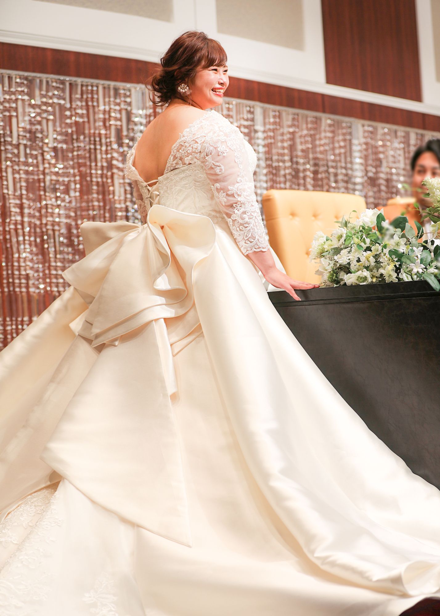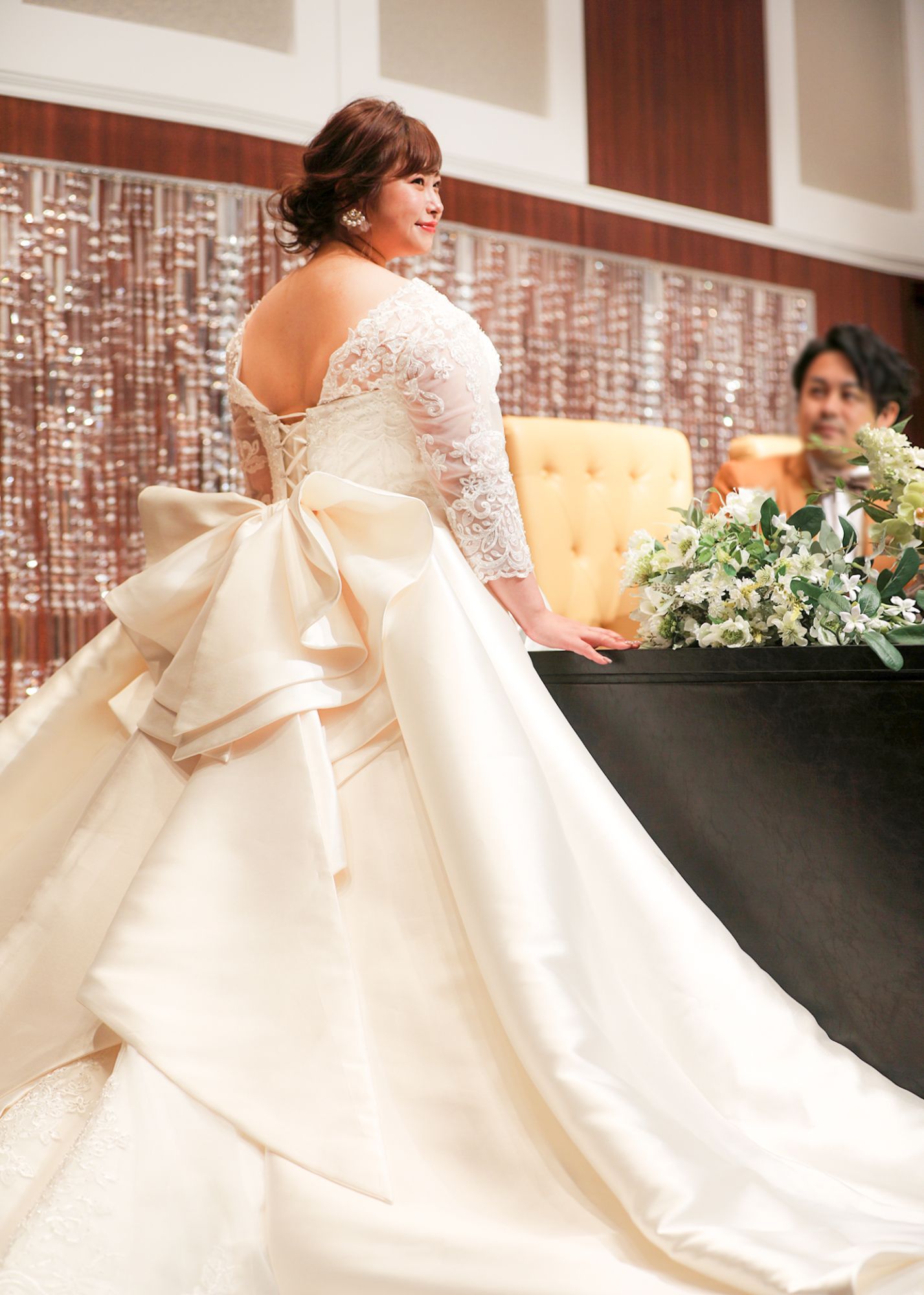 クラシカルな長袖レースが豪華さと細見せを両立させてくれる