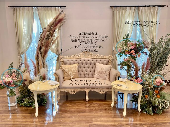 ※ソファ・サイドテーブル・クッションは会場様からの貸し出し品となります。プランには含まれておりません。
