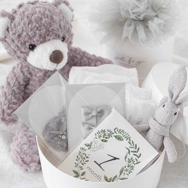 ※チュールスカート1枚(グレー)、リボンの髪留め3個(グレー)、お花のヘアバンド1個(グレー)、うさぎのぬいぐるみ1個、くまのぬいぐるみ1個、マンスリーカード13枚、おむつ13枚のセットです