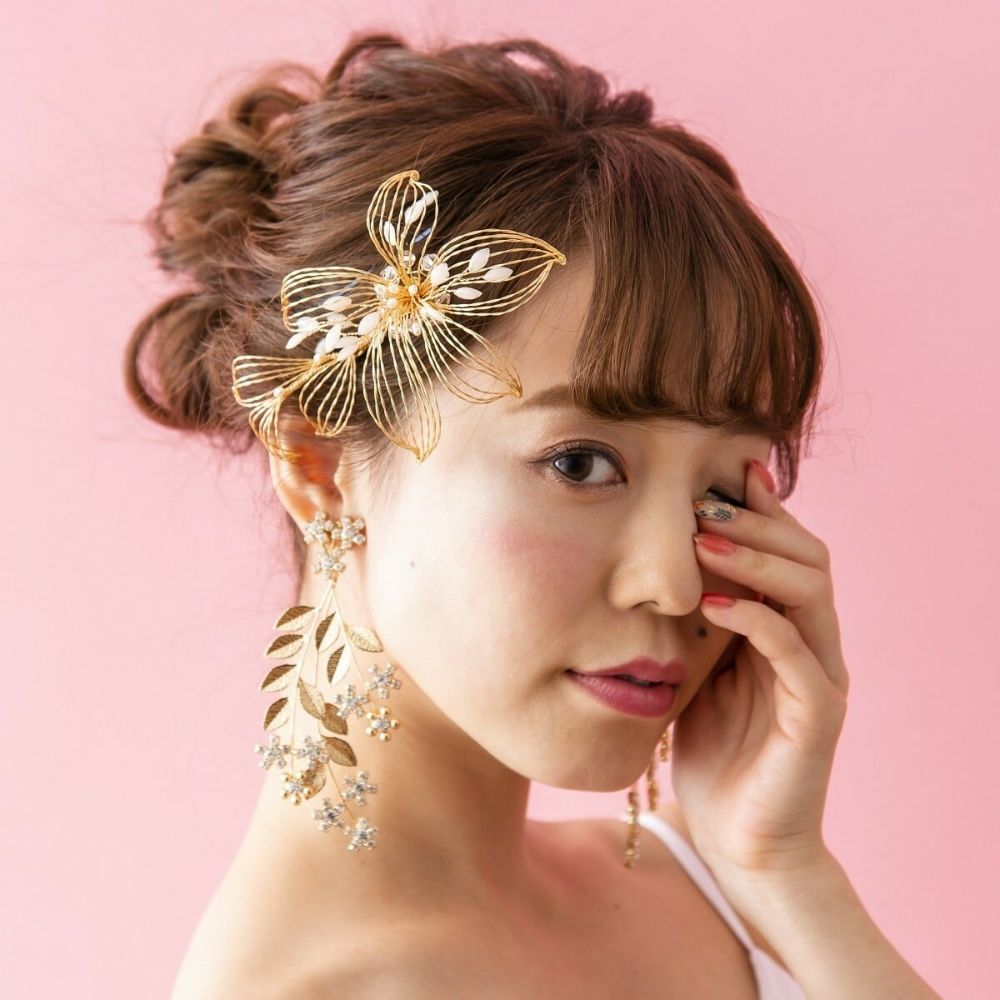 *フラワーモチーフ、かつゴールドアクセサリーなのでナチュラルなウェディングに人気です。