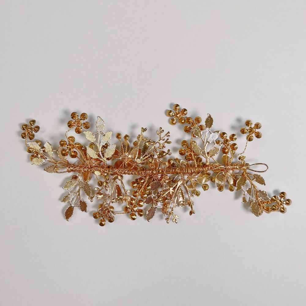 連なったピンクゴールドのフラワーモチーフが、華やかなヘッドドレス。