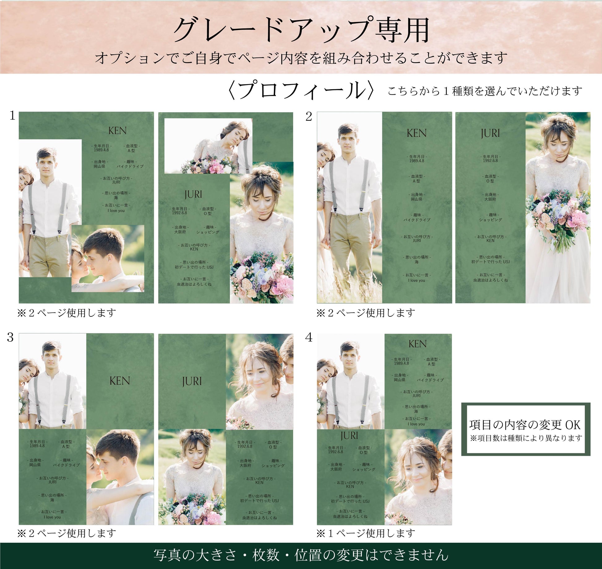 ページ内容が決まっていますので、お急ぎの方や、プロフィールブックを用意したいけどこういうことは苦手…という方にオススメです。