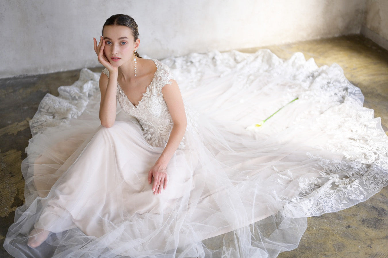 繊細なリーフ柄はヴィンテージシルバーの刺繍がポイントとなり、 裾から立ち登るように華やかにトレーンを彩ります。