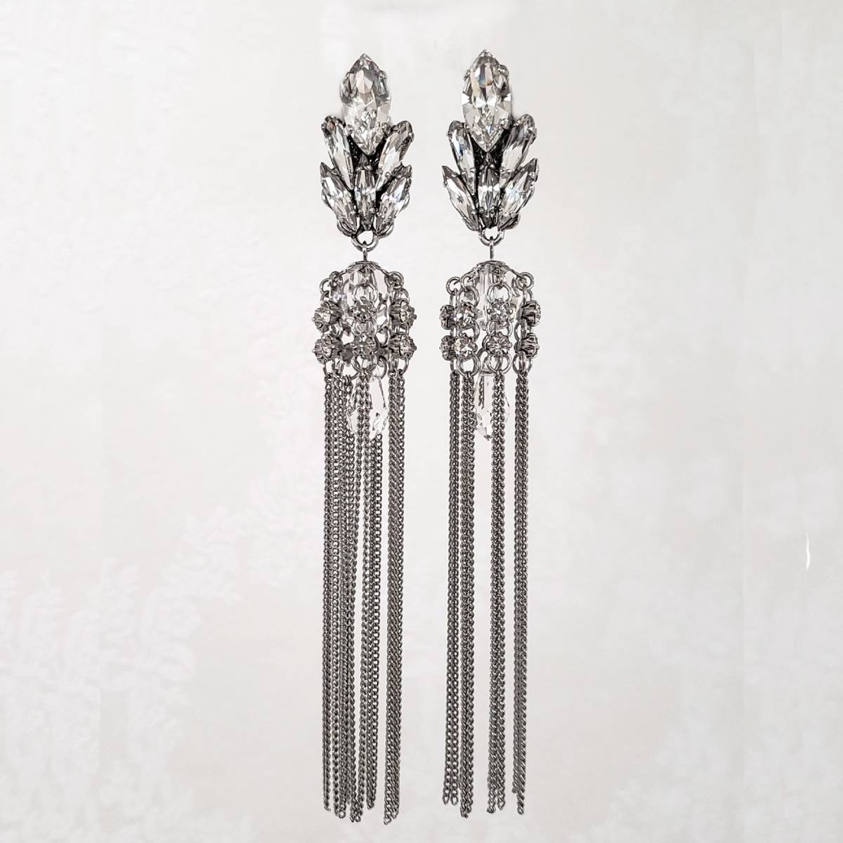 おしゃれ花嫁に人気のタッセルイヤリング。スタイリッシュで素敵なウェディングを演出してくれます!ビジューがとっても素敵なシャンデリアイヤリング。