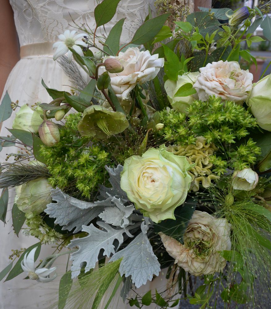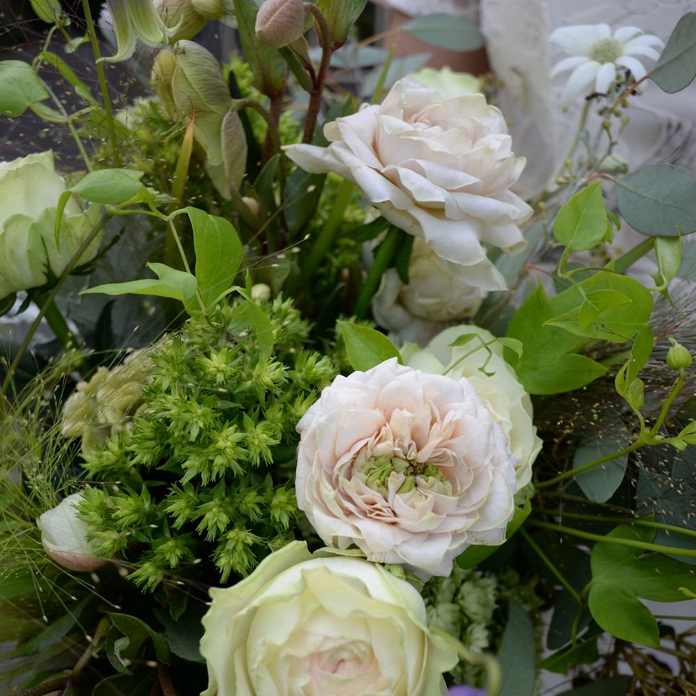 ナチュラルグリーンはユーカリやシルバーリーフなどの人気のグリーンをたくさん使用し、バラは大輪のイングリッシュローズを使用しています。