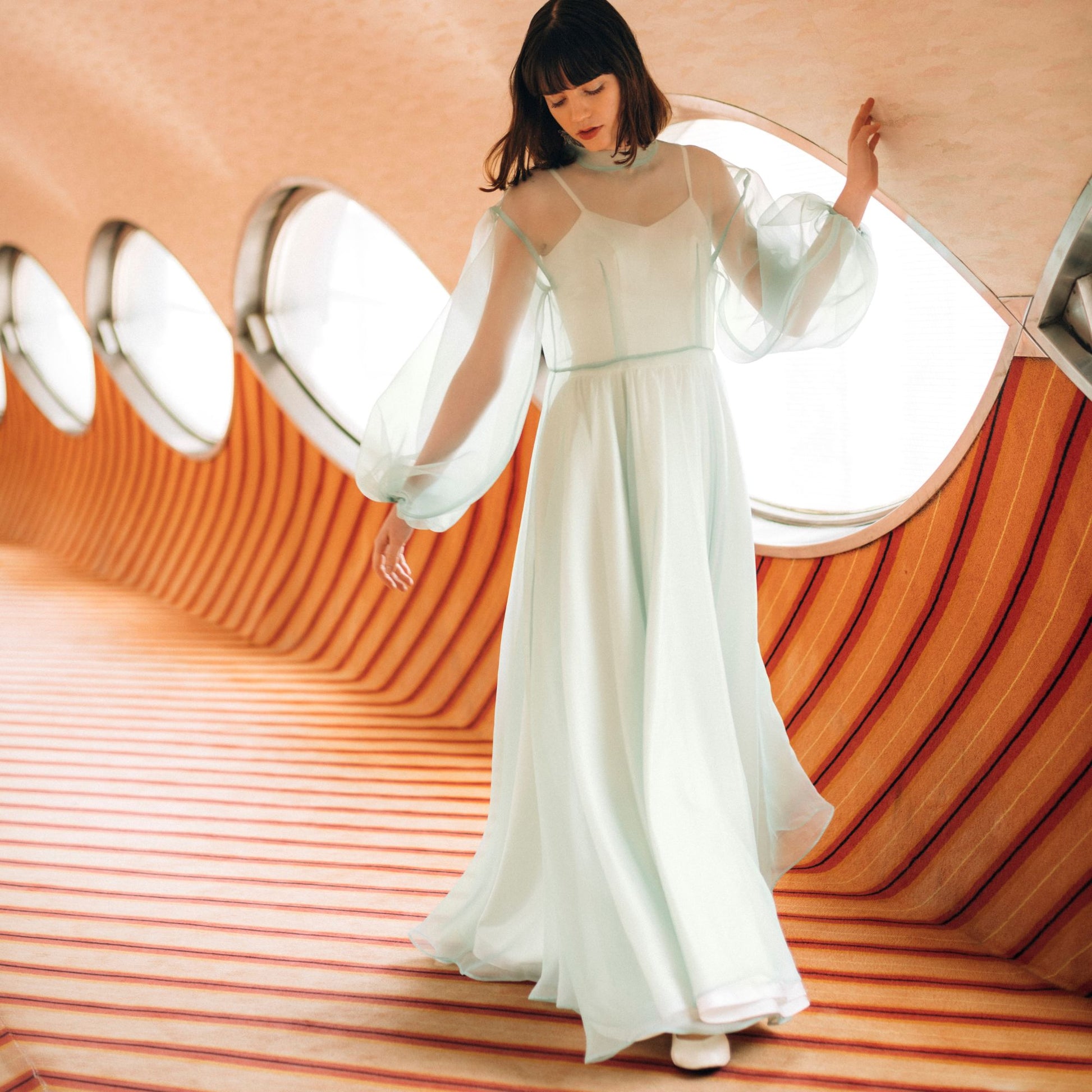 シンプルなキャミソールドレスにブルーグリーンのオーバードレスをコーディネート。オーガンジーの軽やかな素材感が動きのあるシルエットに。