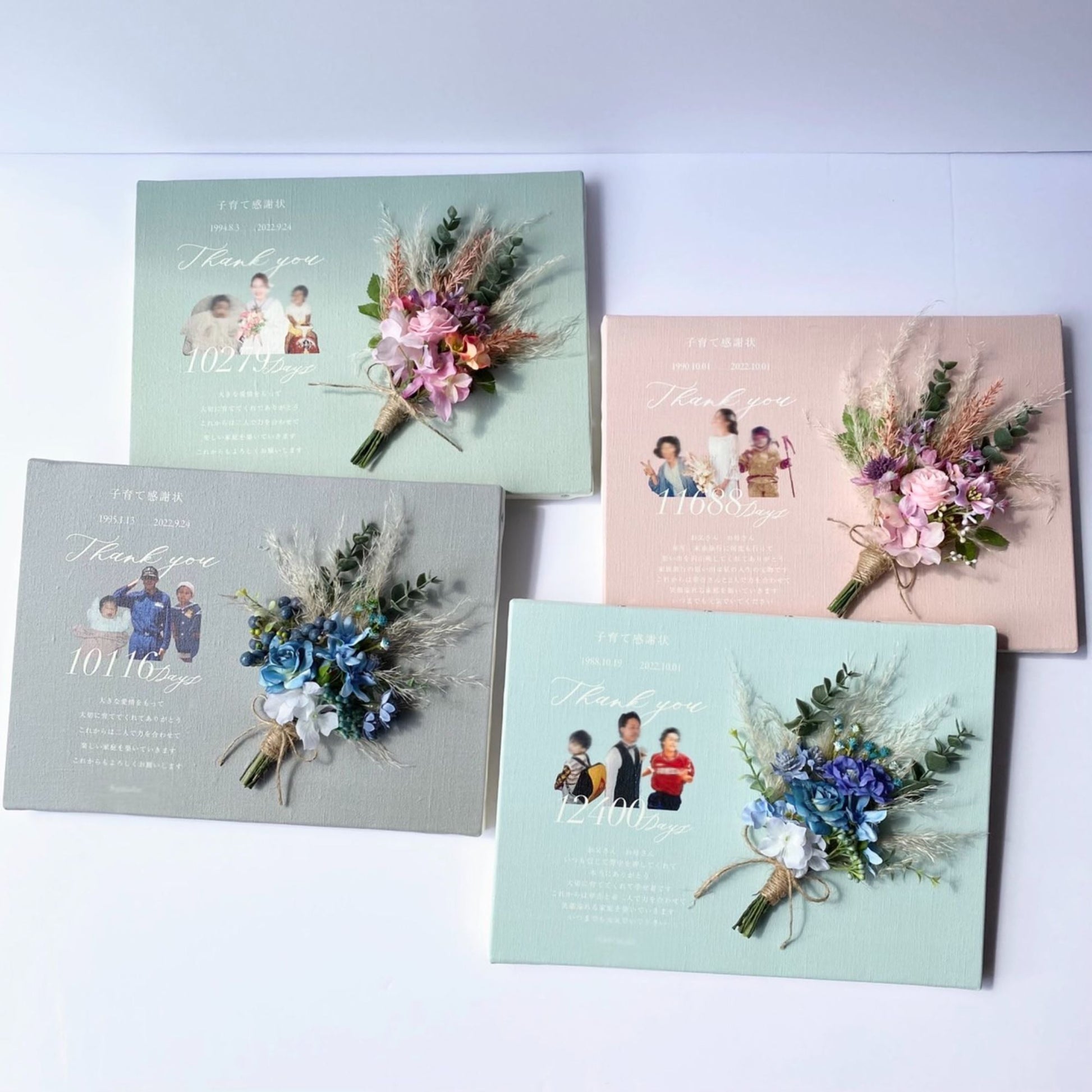 | 素材 | 木枠に布地を巻き付けた本格的なキャンバスの子育て感謝状です。 キャンバスボードにお写真と文字を印刷し、お届けします。 |
