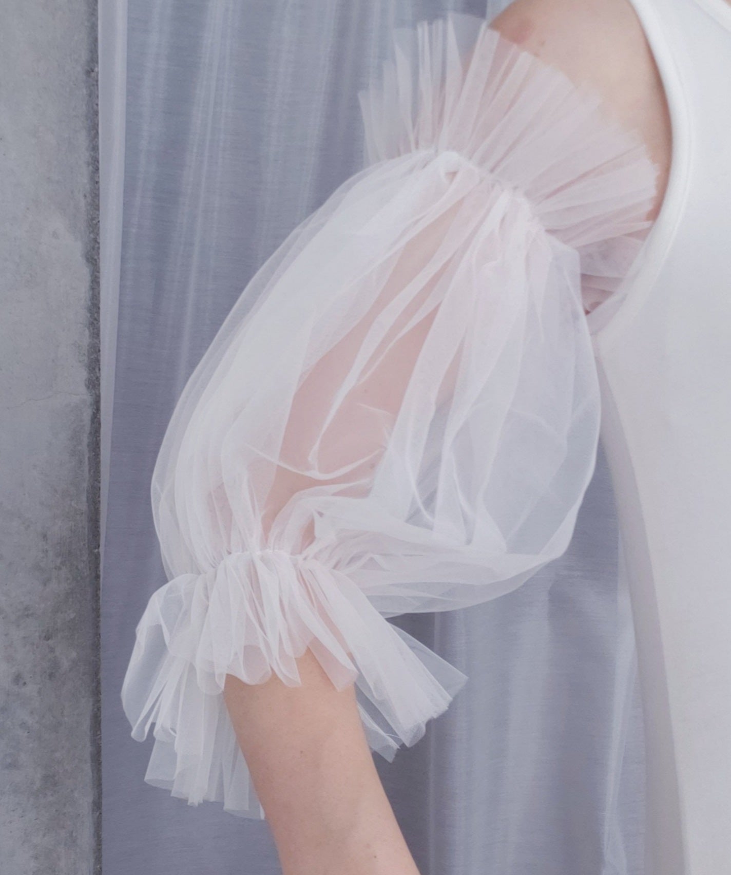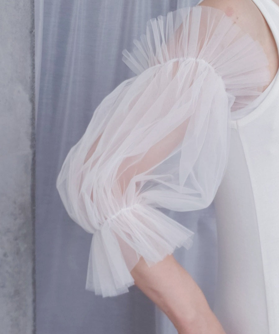 パフスリーブのつけ袖。両サイドはゴムなのでお好きな長さやふんわり感にアレンジできます。