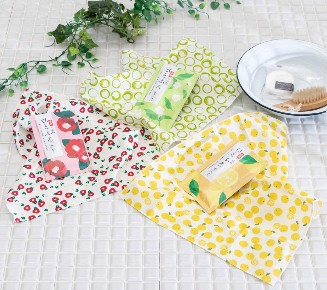 ハンカチは手ぬぐい生地で中身の入浴剤 ゆずの香り、椿の香り、抹茶の香りに合わせてプリントしました。