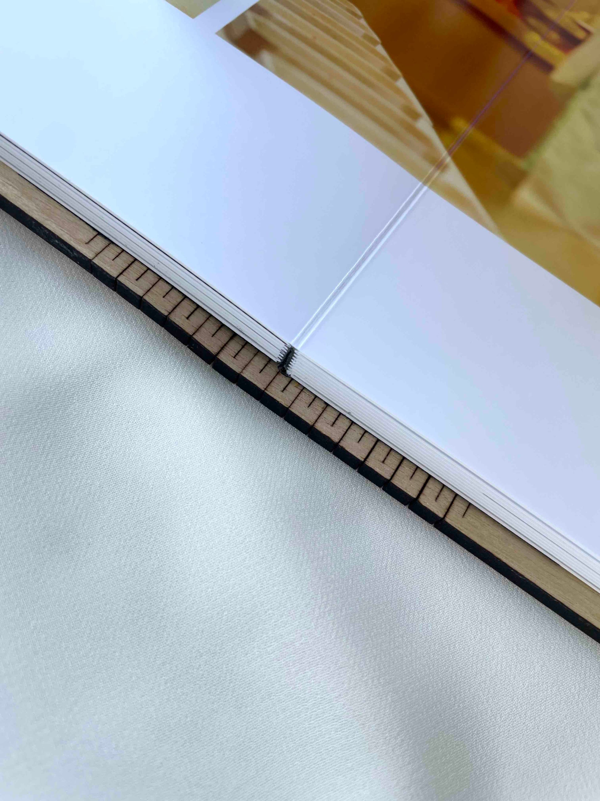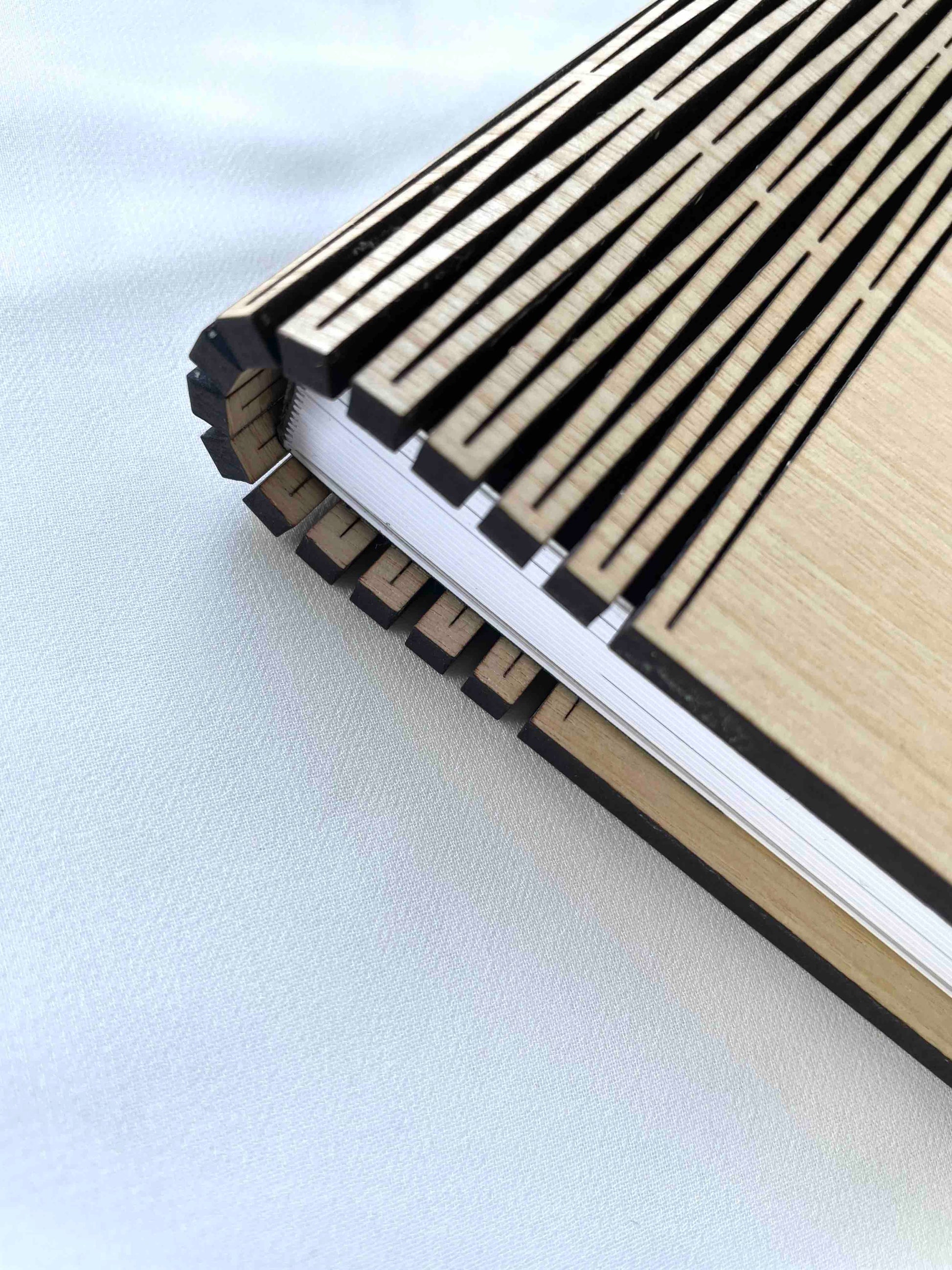 表紙のしなやかな開閉構造とレーザー彫刻が特徴的な、木の風合いを最大限に引き出した商品です。