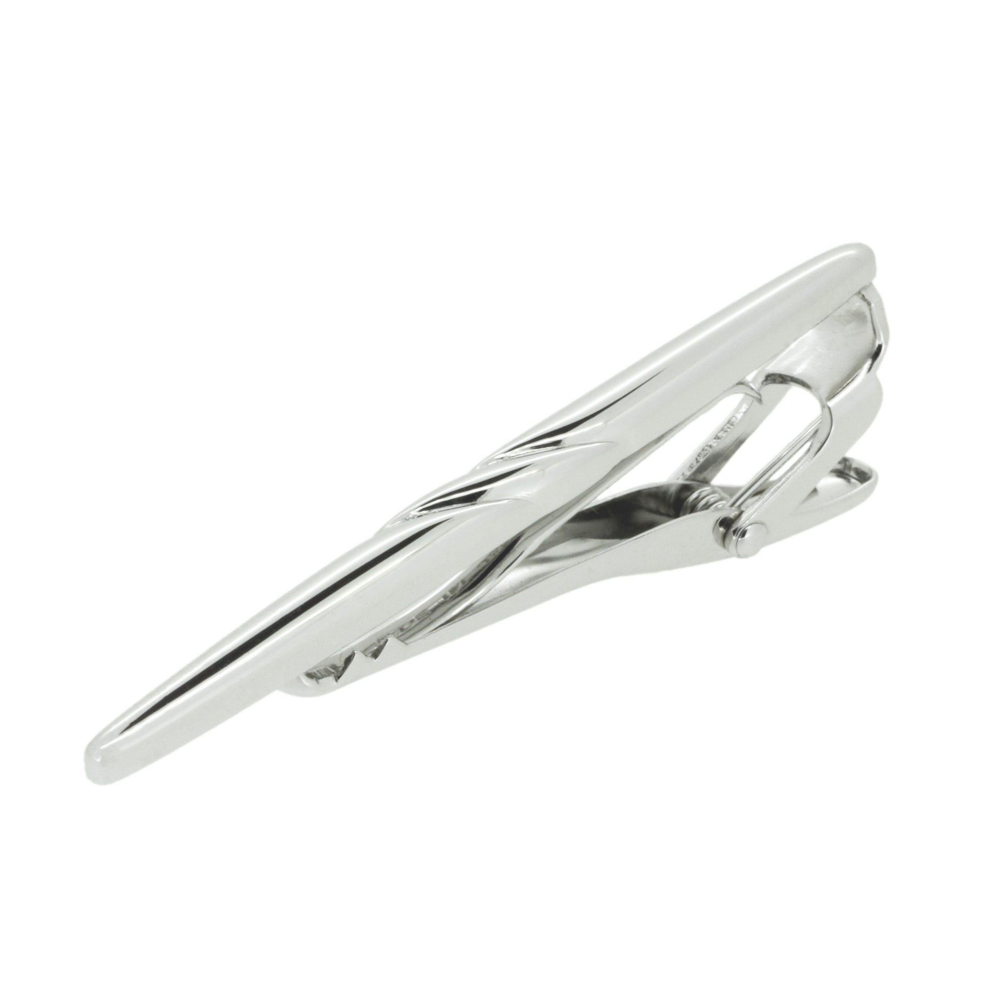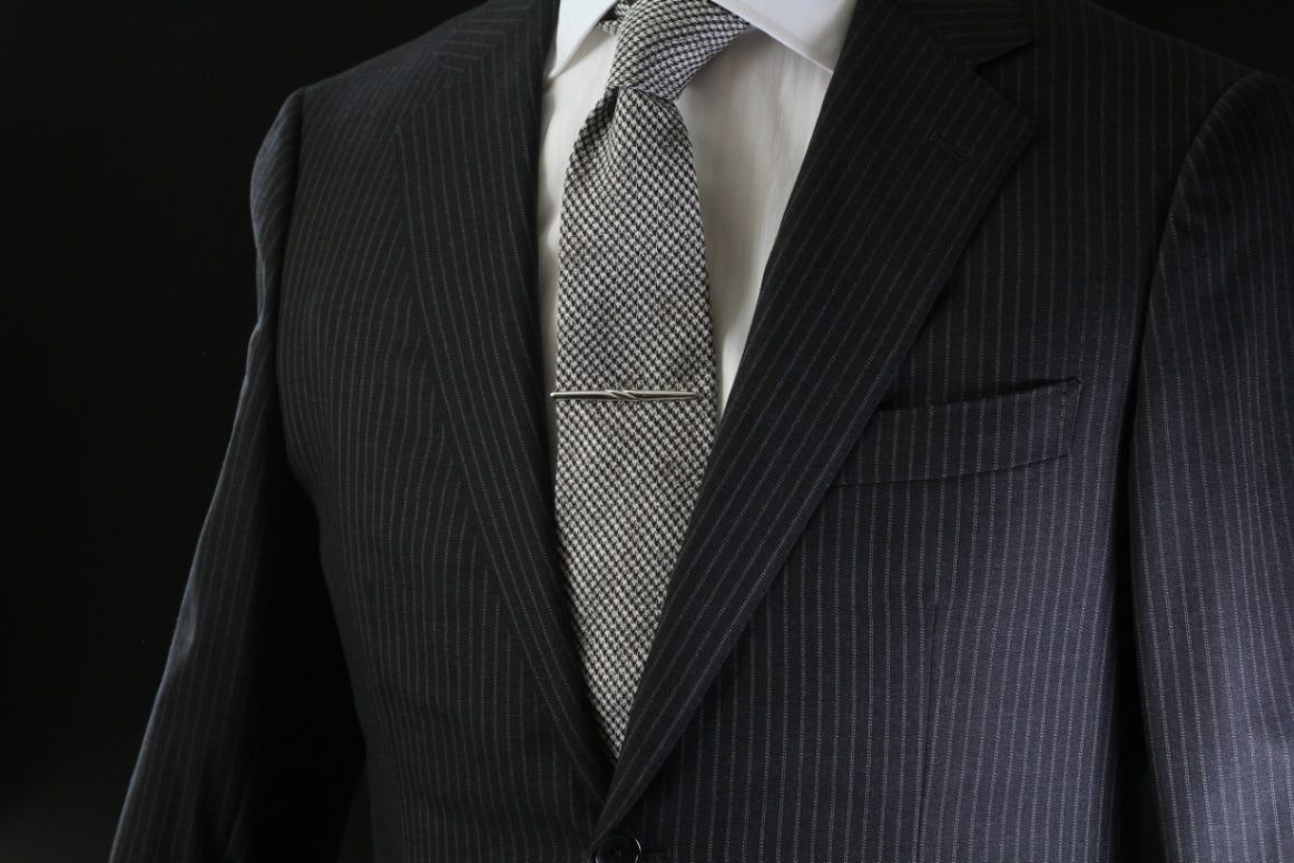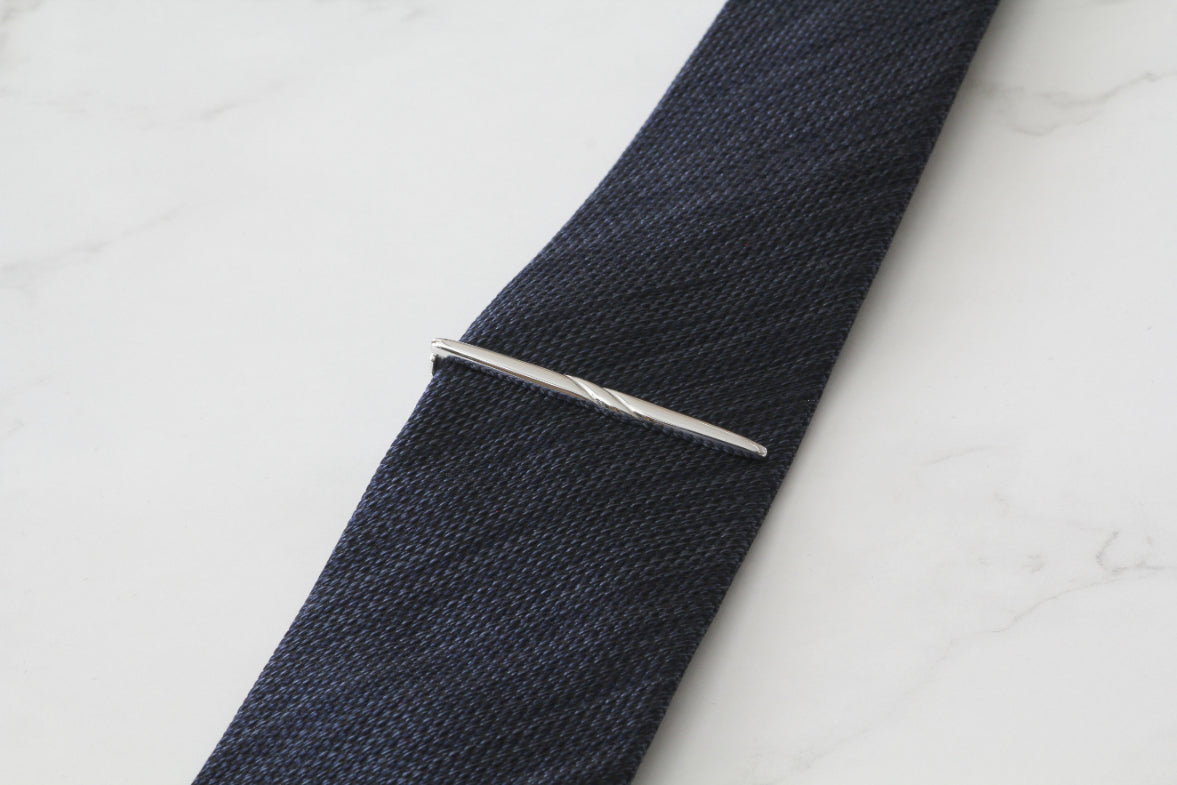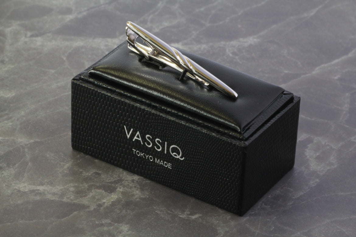 付属は2種類のバネ(スプリングと板バネ)を効かせて、先端部分と板バネの2か所でネクタイをしっかりとホールドしています。着用時はネクタイの裏側にあるため見えませんが、流線形のやわらかいデザインでとても上品なイメージです。隠れたおしゃれを楽しめます。