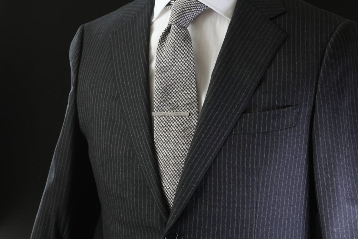 付属は2種類のバネ(スプリングと板バネ)を効かせて、先端部分と板バネの2か所でネクタイをしっかりとホールドしています。着用時はネクタイの裏側にあるため見えませんが、流線形のやわらかいデザインでとても上品なイメージです。隠れたおしゃれを楽しめます。