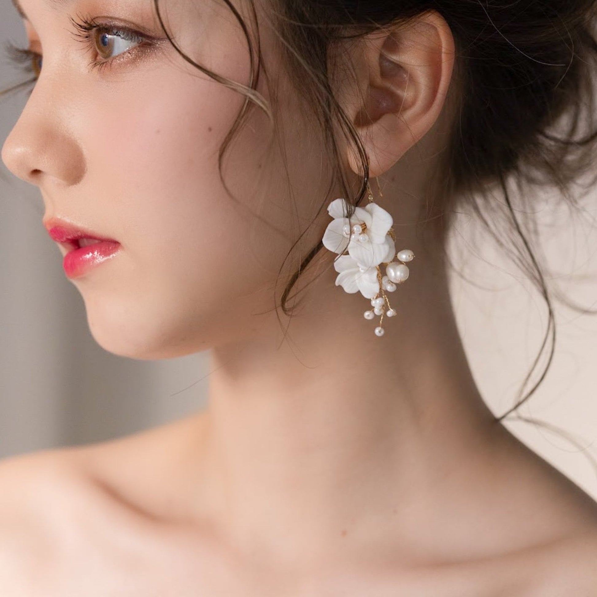 【ピアス】ブライダル 小枝ピアス ホワイトフラワー ゴールドリーフ u16 【結婚式 ピアス イヤリング】