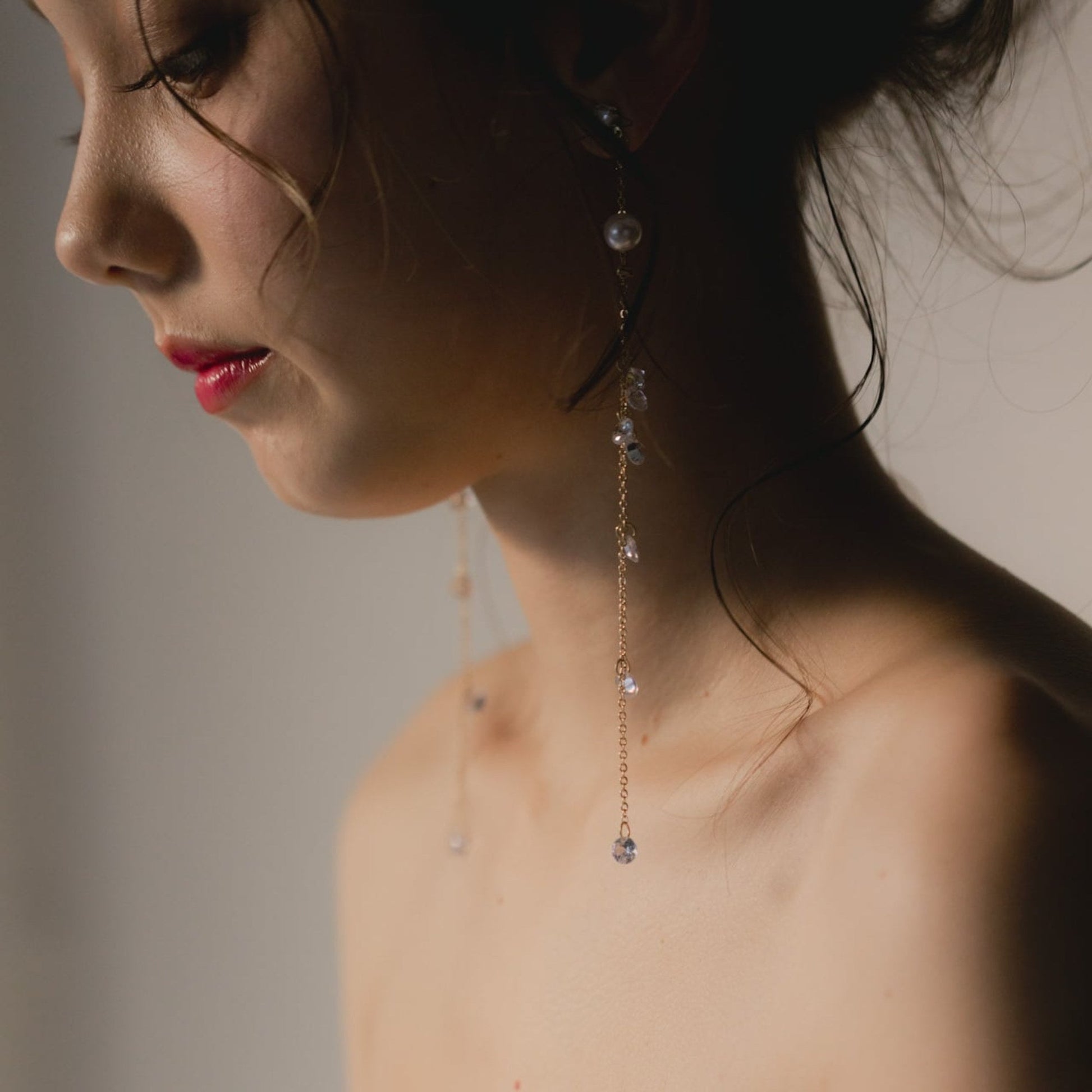 ・クリスタルとパールのラインピアス