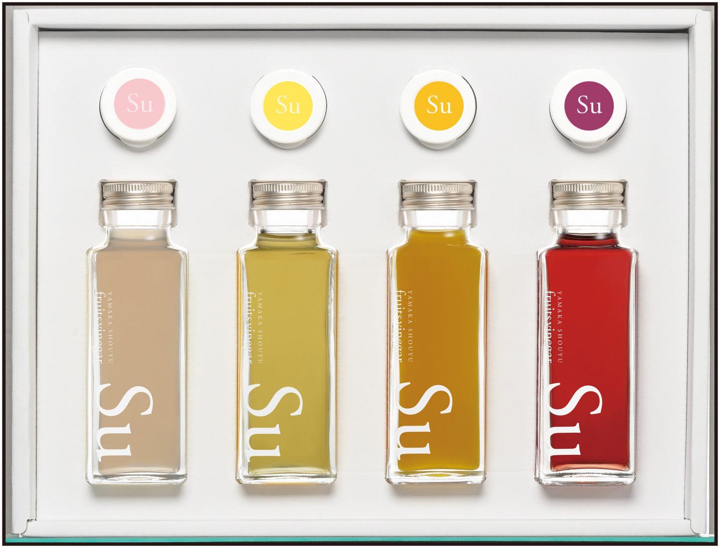 山口県で採れた果物(りんご,みかん,梨,ブル-ベリ)を発酵させて造った果実酢に、オリゴ糖や粗糖をプラスして、やさしい味に仕上げました。
