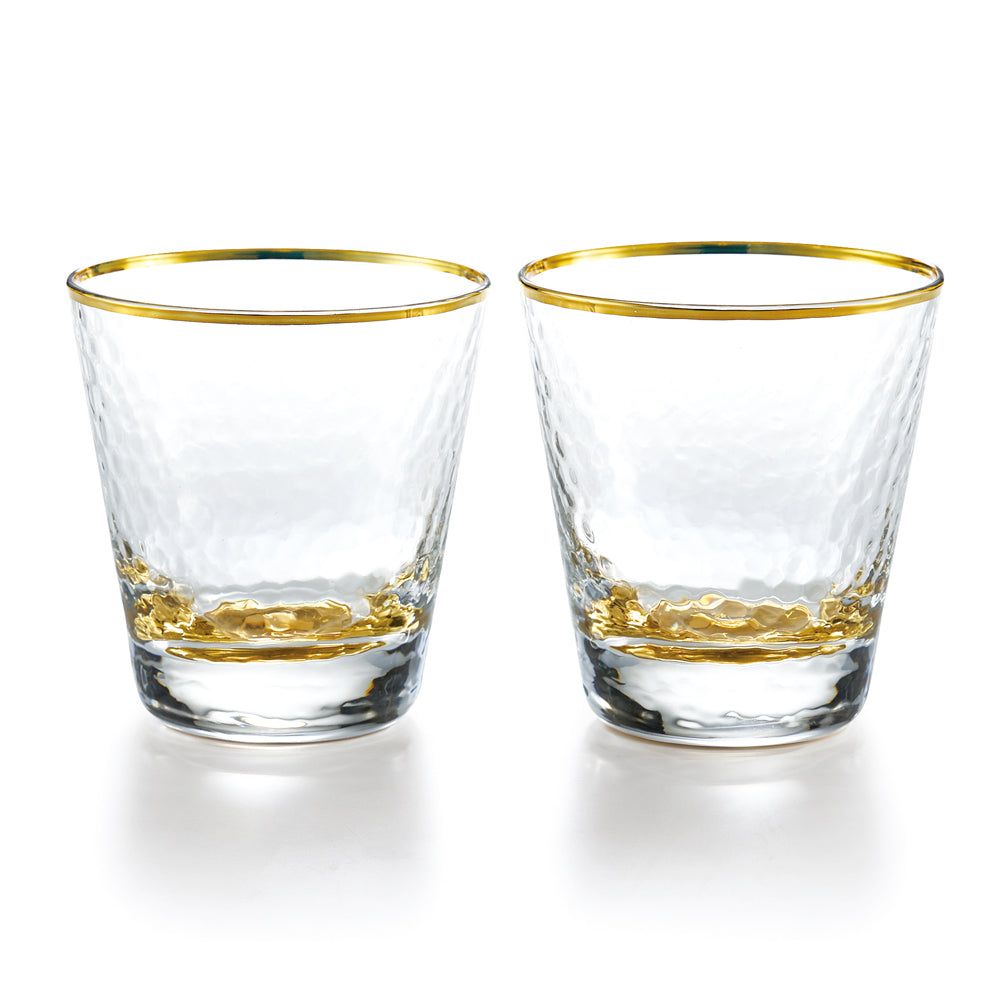 光を受けてキラキラと輝く美しいグラスに煌びやかな金色が反射して・・・多彩な表情を見せるグラスが満ち足りた時間へ誘います。凸凹模様が美しいグラスの口元と底部に18Kゴールドを施すことで華やかな印象に仕上げました。
