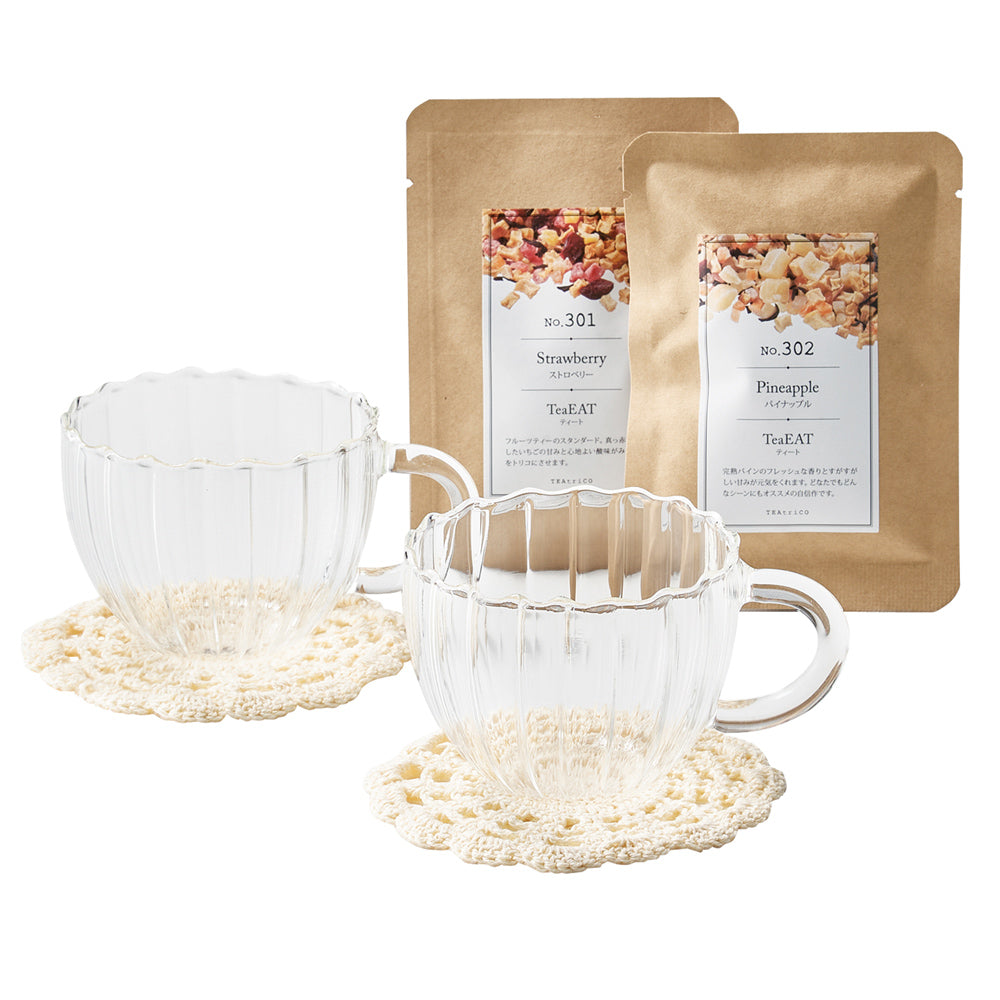 お茶の色味が楽しめる、光を反射してきらきら輝く耐熱ガラス製のペアカップと一緒にお贈りします。