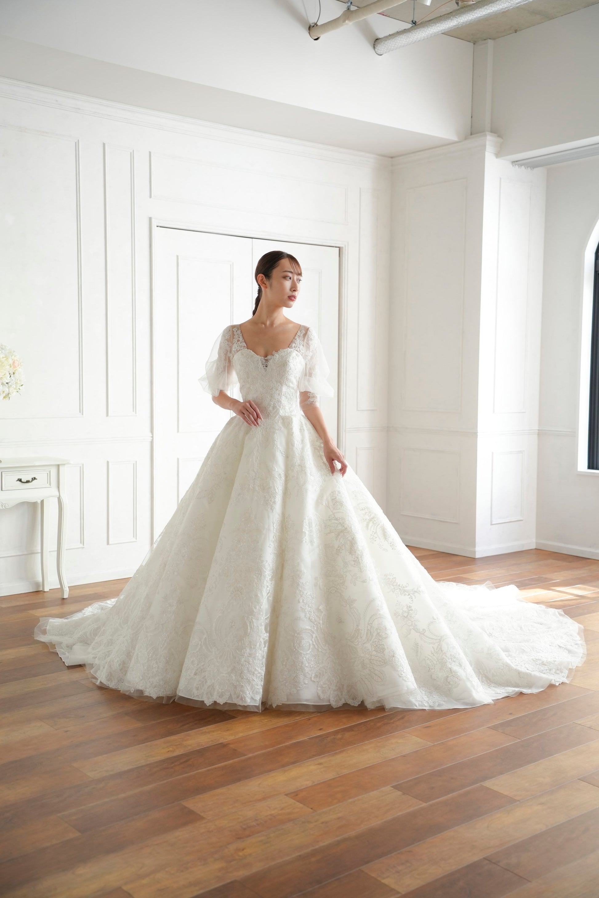 胸元のV カットや、チュールのビックパフスリーブがクラシックに