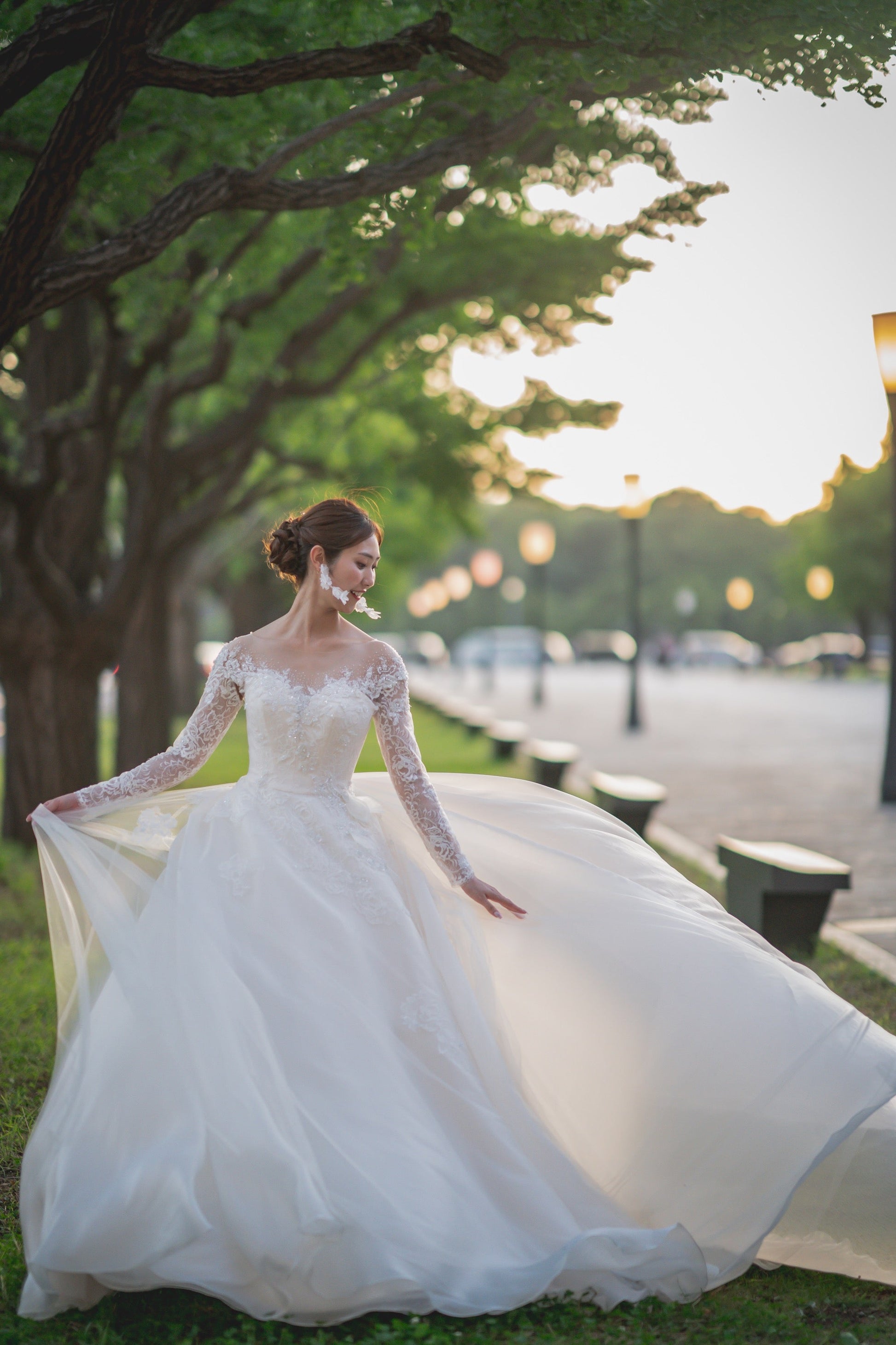 トレーンや身頃に散りばめられるシルクコサージュの花びらが立体感を引き立てます。