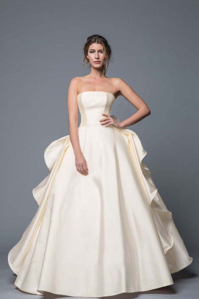 バックスタイルは柔らかいフォルムと緩やかに流れるようなラインで女性の優雅さを表現した一着。