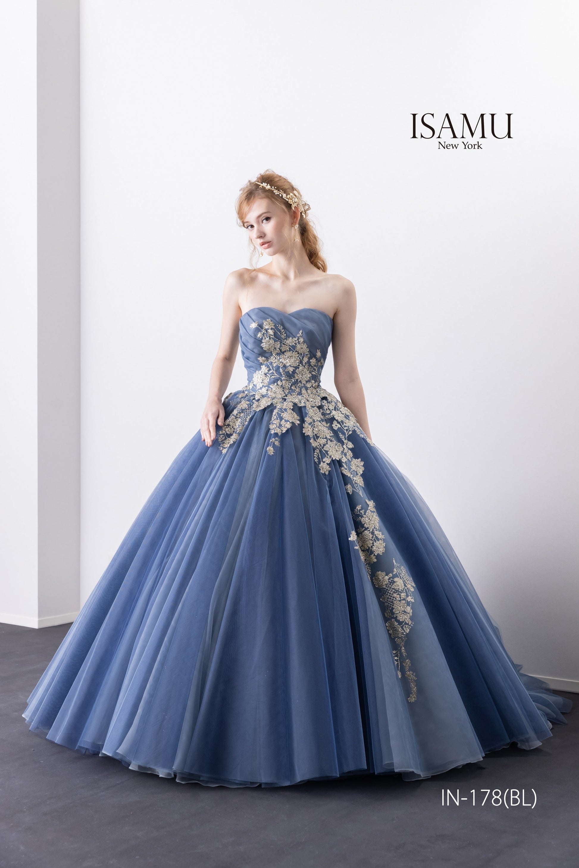 くすみブルーに流れるようなグリッターモチーフがキラキラと輝く上品なドレス
