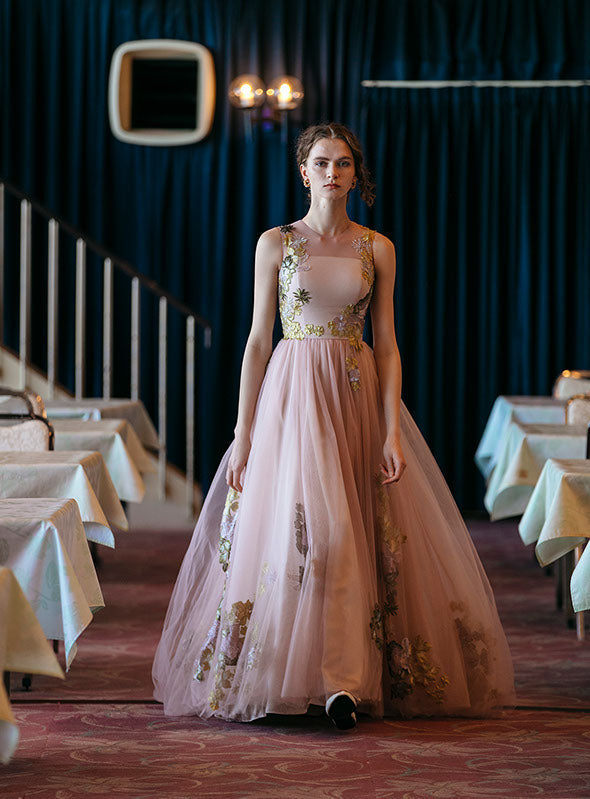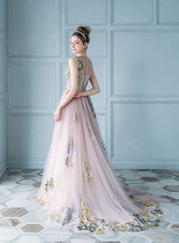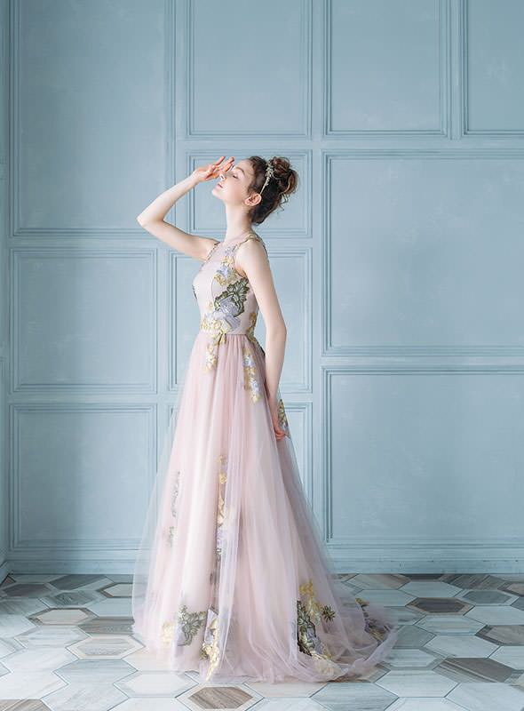 ダスティピンクの柔らかなチュールにアンティークな刺繍を身にまとった着たいドレスとなりたい私