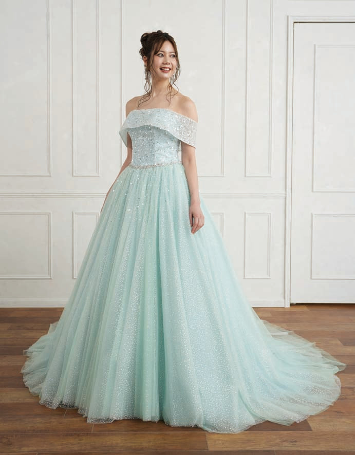 ミントグリーンの爽やかな色合いに、グリッターの輝きが美しいドレス。