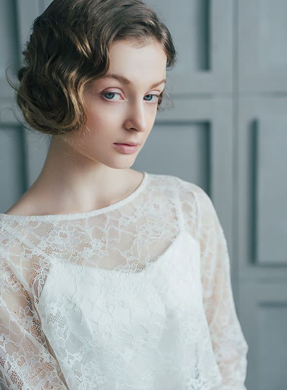 肌の透明感を際立たせるシアーなレースとスカラップデザインのロングスリーブで上品勝愛らしさを表現。