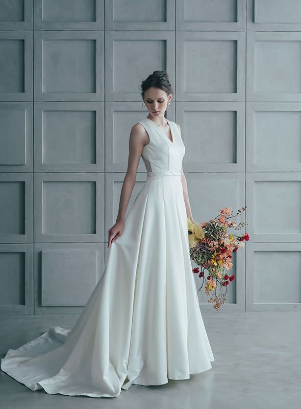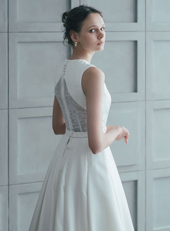 Vネックラインは大人エレガントな雰囲気を楽しめるドレス。バックスタイルのレースとクルミボタンが素敵。