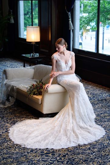 トレーンも長めで存在感があり、ホテルでの結婚式やフォトウェディングでも魅力的なバックスタイルを演出します。