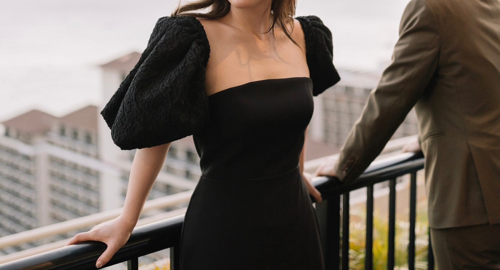 ブラックドレスでも強すぎずパフスリーブでやわらかい印象に♪