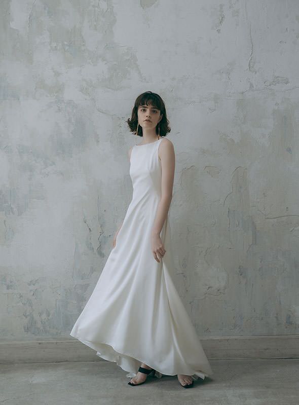 フェミニンなモードを引き出すサテンのドレープとダウンヘア トークハットをアクセントに添えれば絶妙なニュアンスコーディネートが叶う。