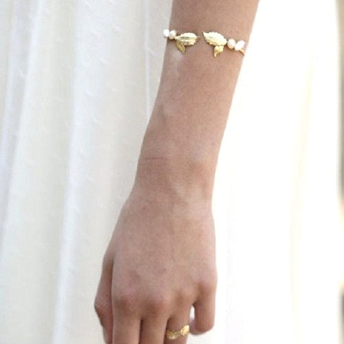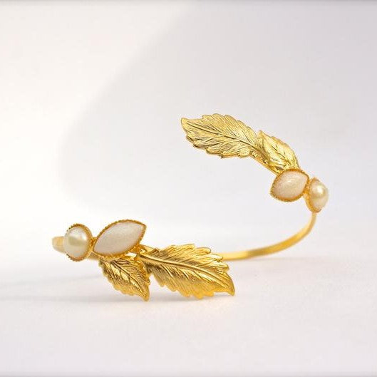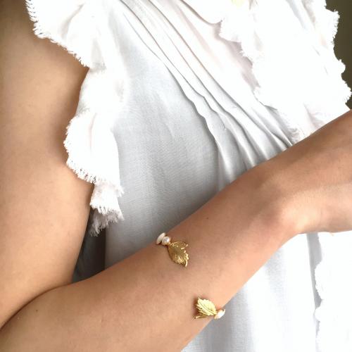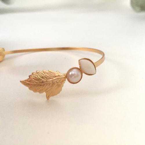 2枚のリーフとパール・ホワイトビーズが両端にデザインされたバングルタイプのブレスレット。
