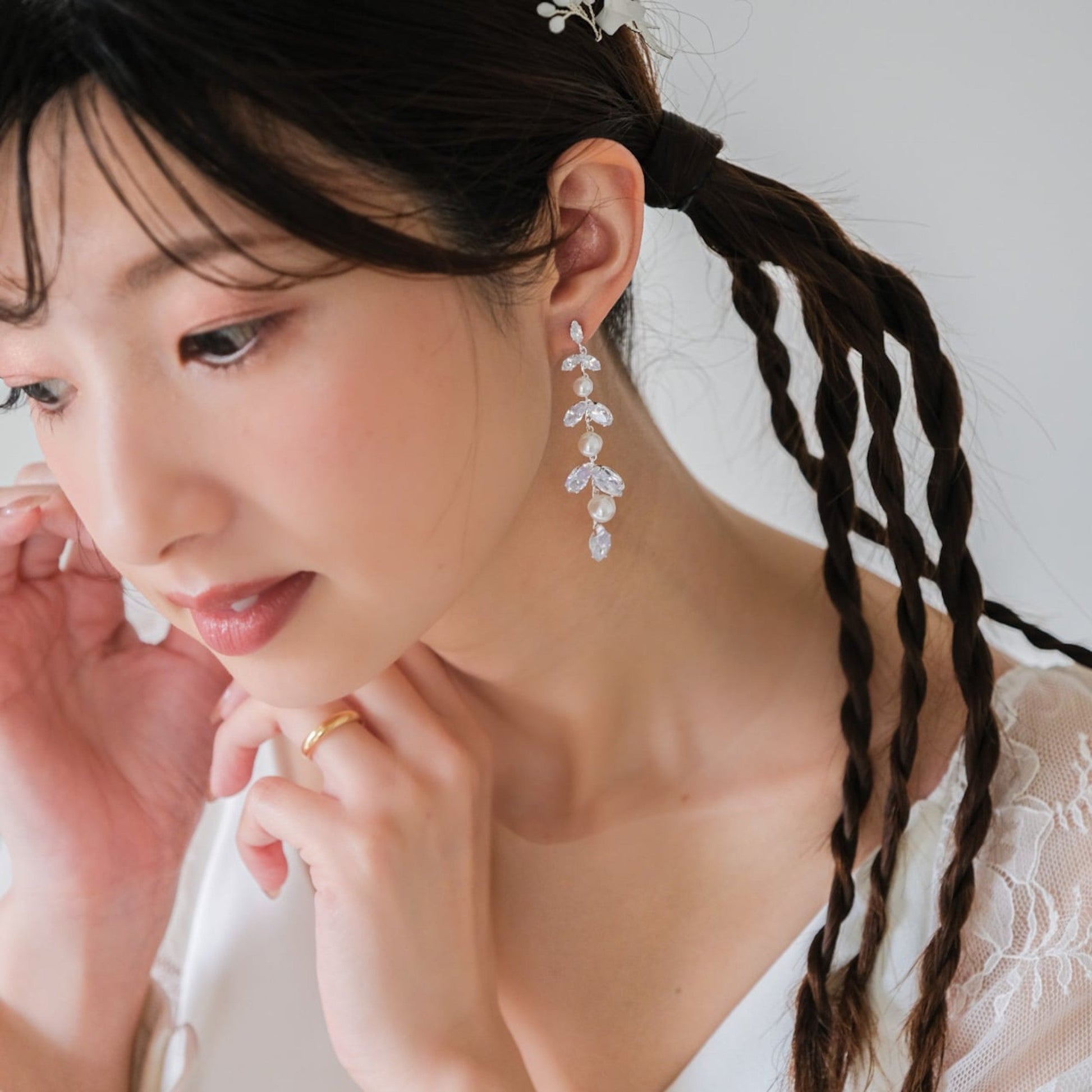 【ピアス】ブライダル ジルコニア パール リーフ シルバー v3【結婚式 ピアス イヤリング】