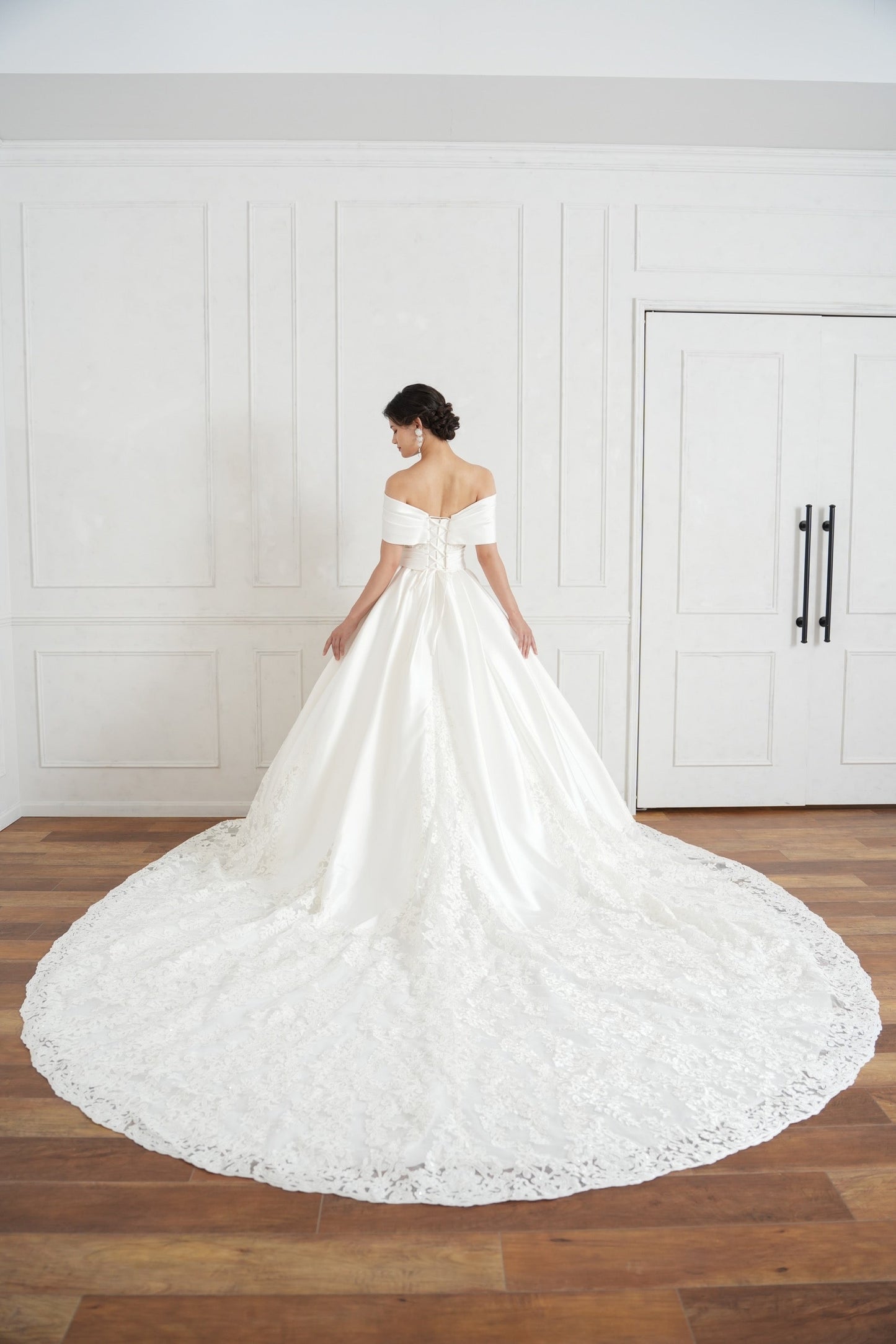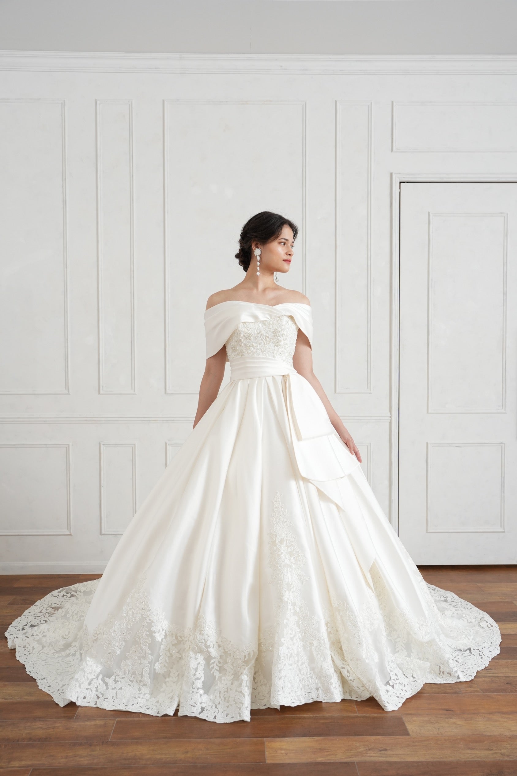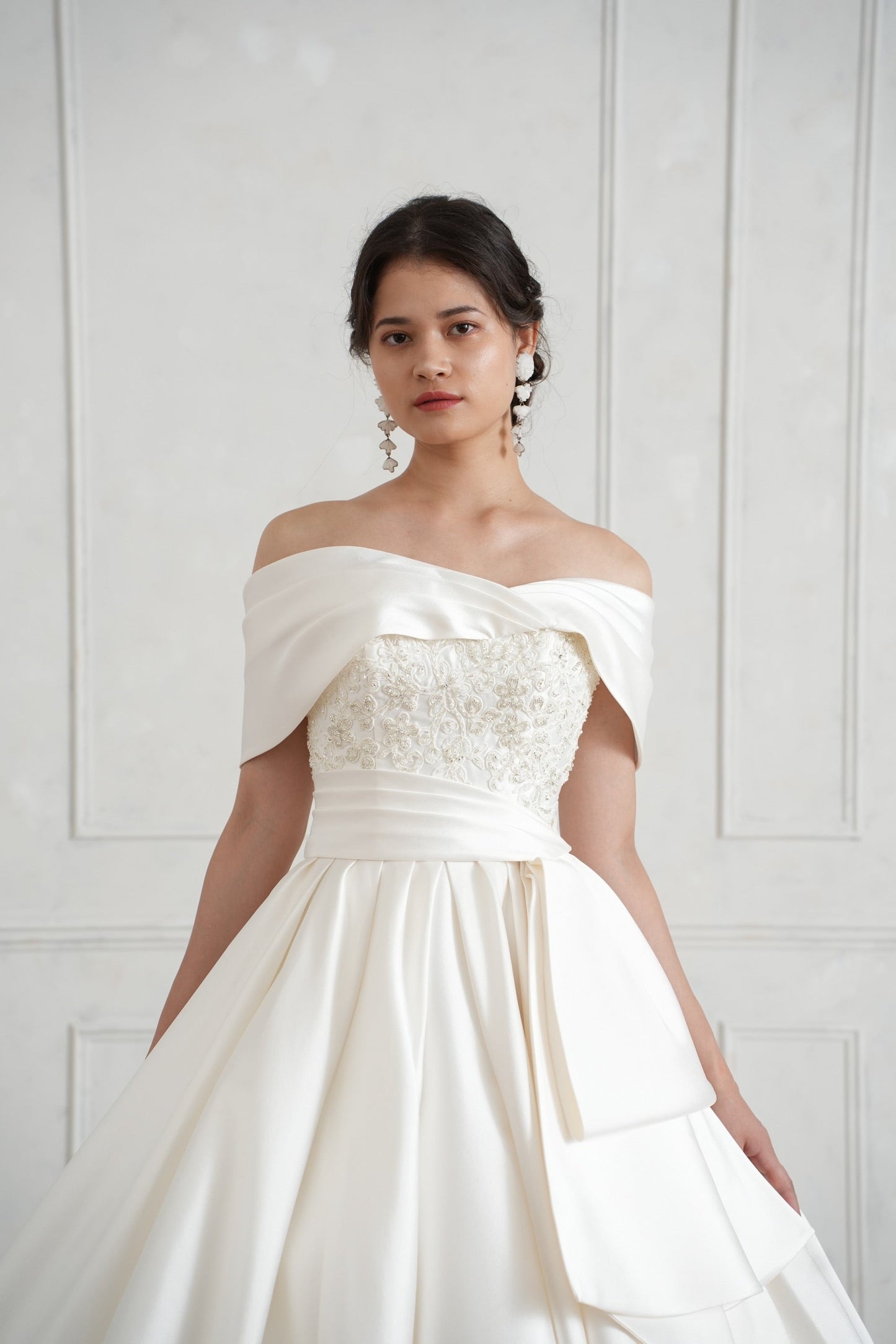 光沢の美しいミカドサテンがおりなす一枚気になる二の腕も存在感のある美しいケープがカバーします