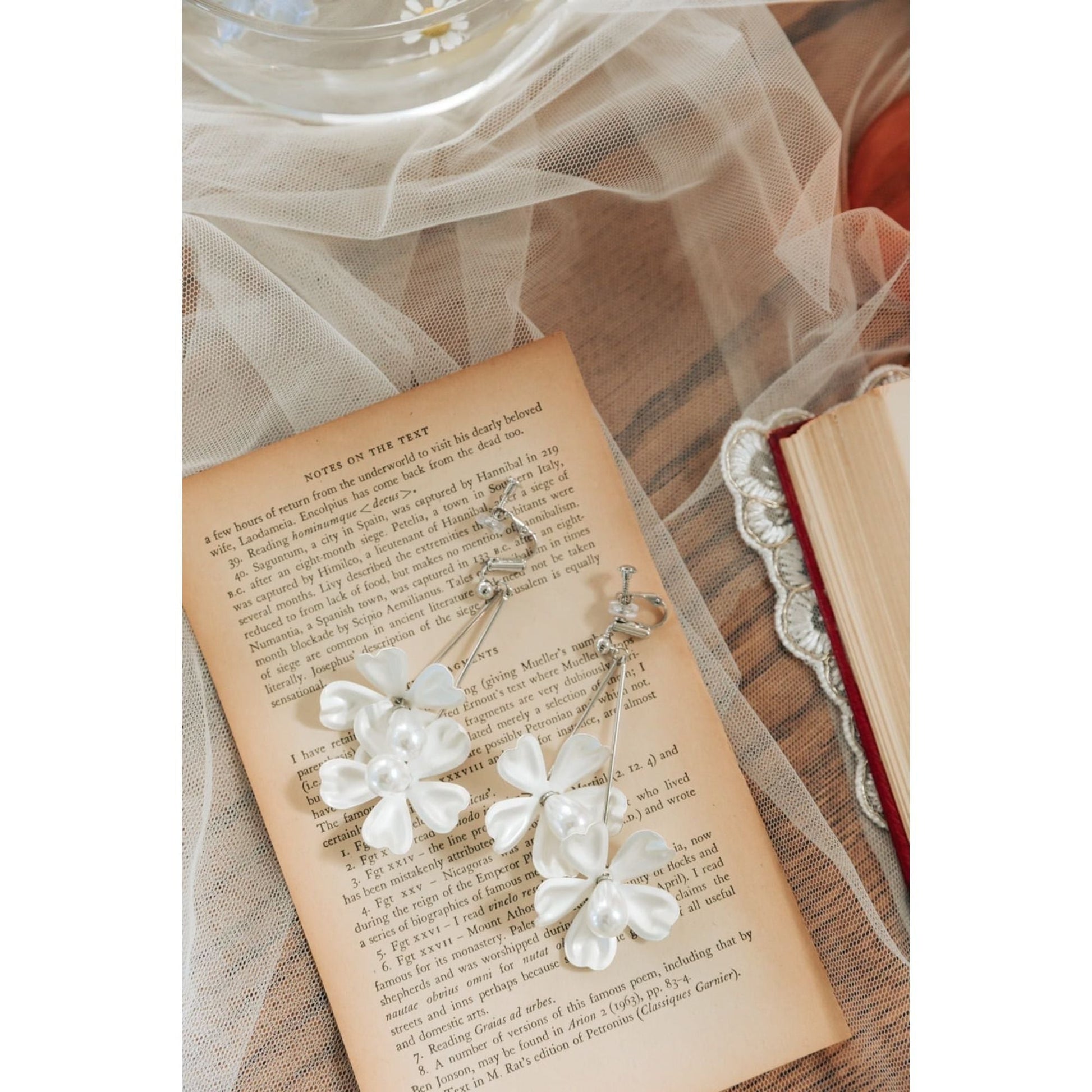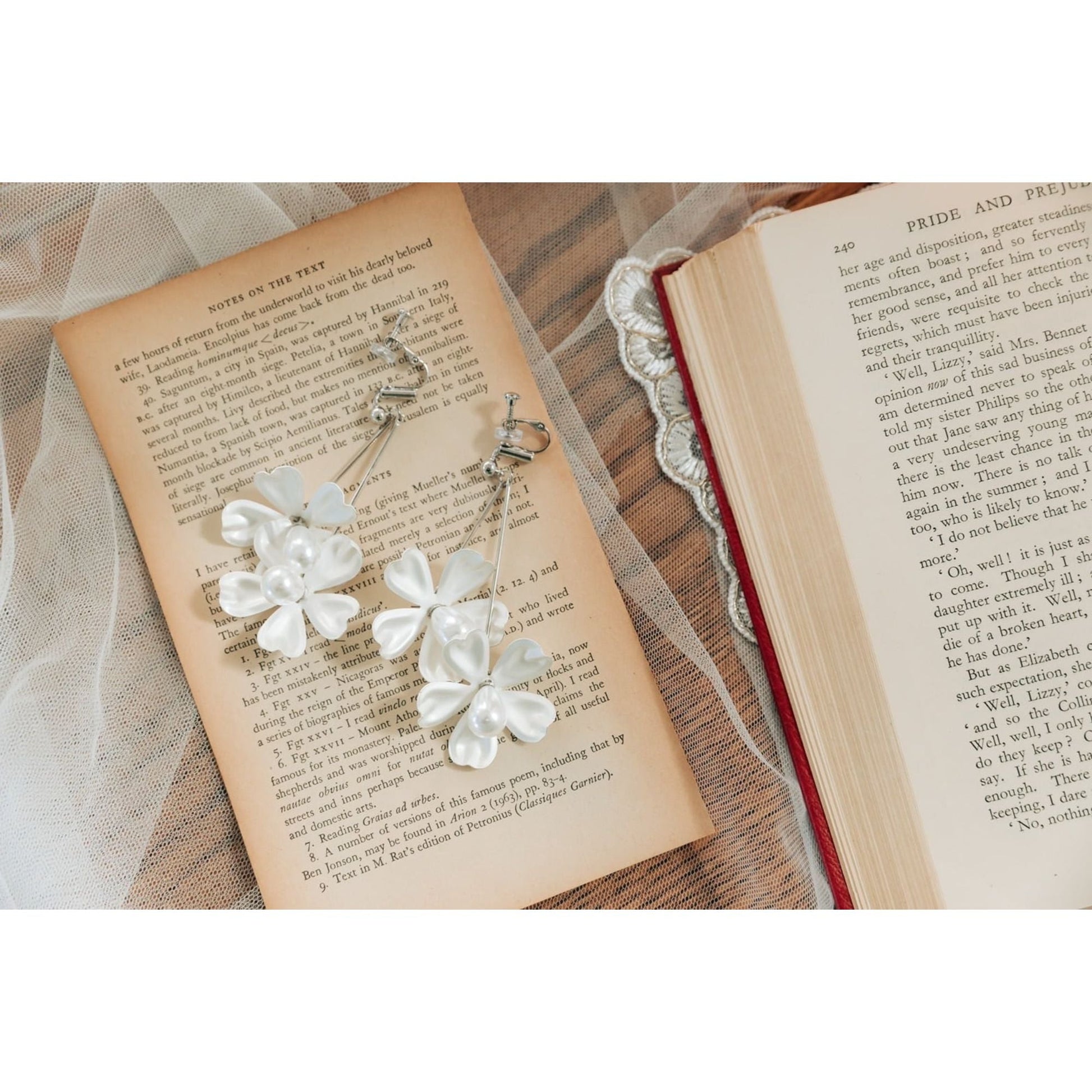フラワーモチーフと中のドロップパールが動く度に揺れ輝き、女性らしさを表現するウェディングアクセサリーです。