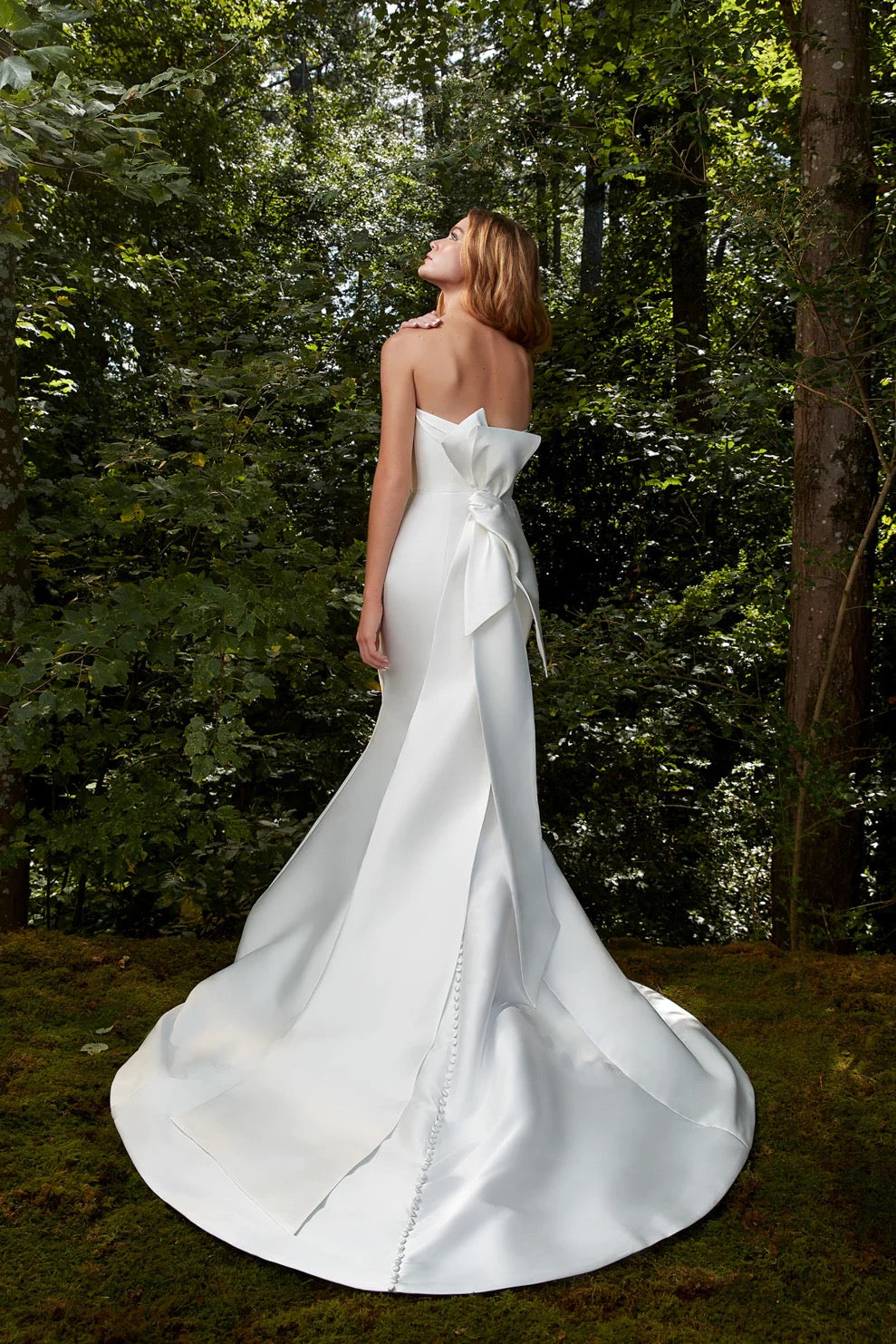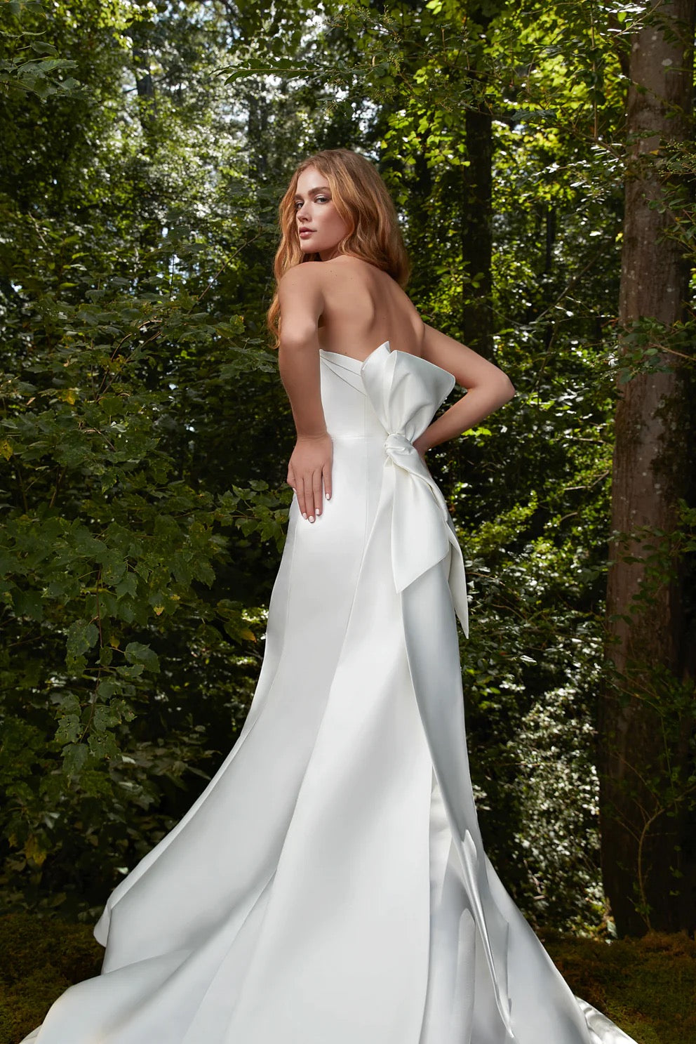 立体的なドレープ、後ろの大胆なリボンが特徴。