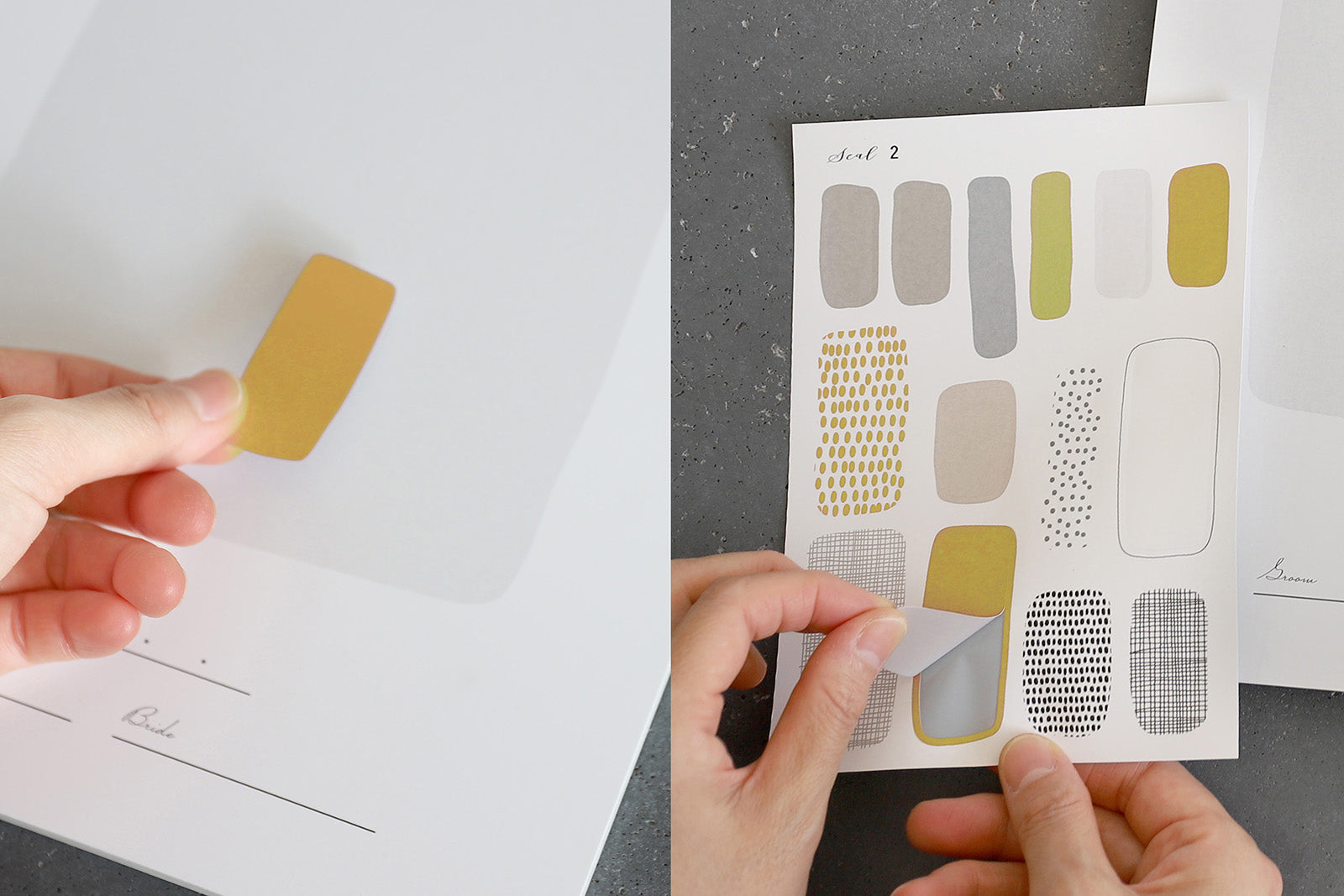ウェルカムスペースに置いてゲストの皆様に1枚〜数枚ずつシールを貼っていただくと、世界にひとつだけのアート作品が完成するゲスト参加型の結婚証明書です。