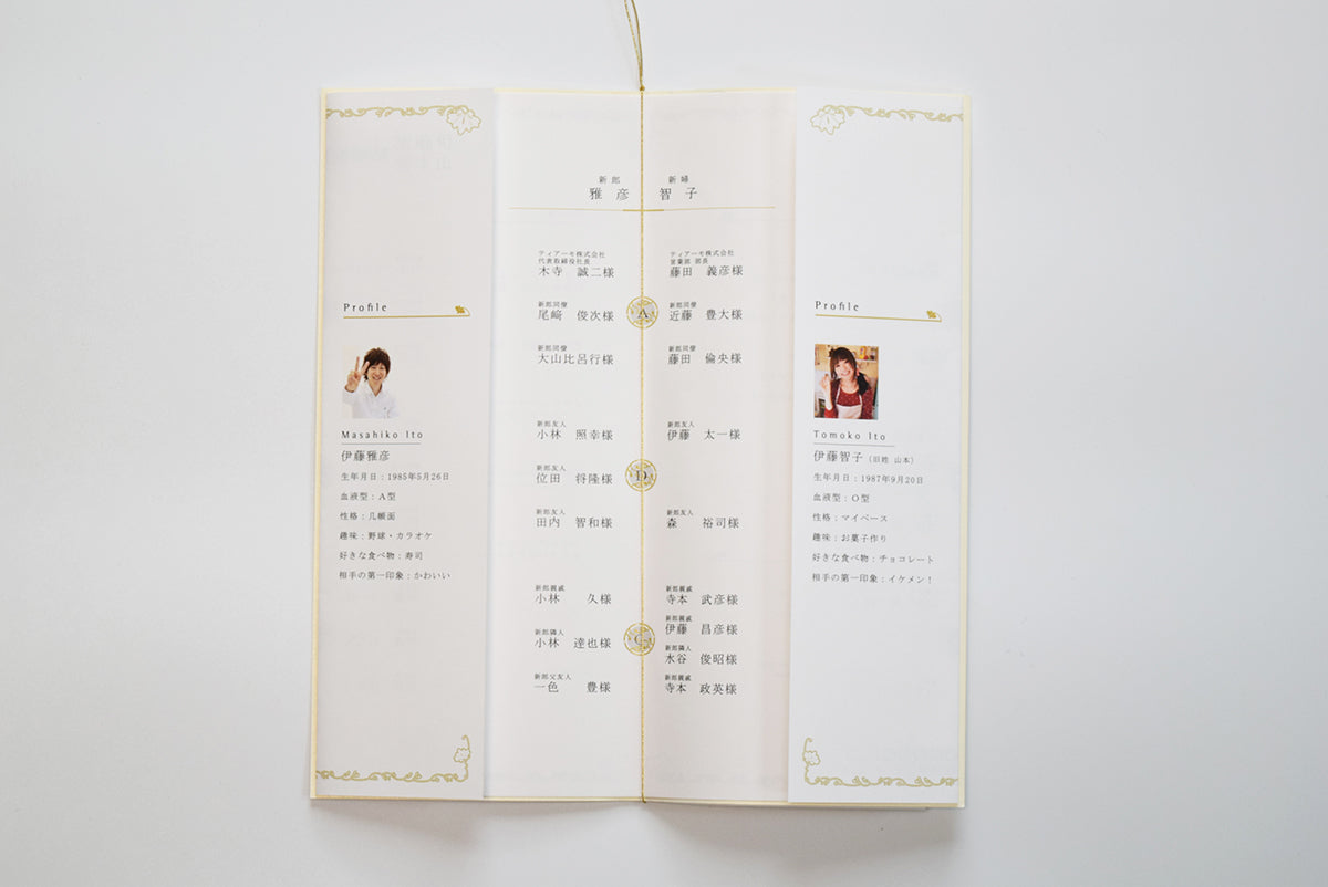 | 印刷備考 | 表面…席次表 裏面…挨拶・新居案内・メニュー・プロフィール(写真有) |