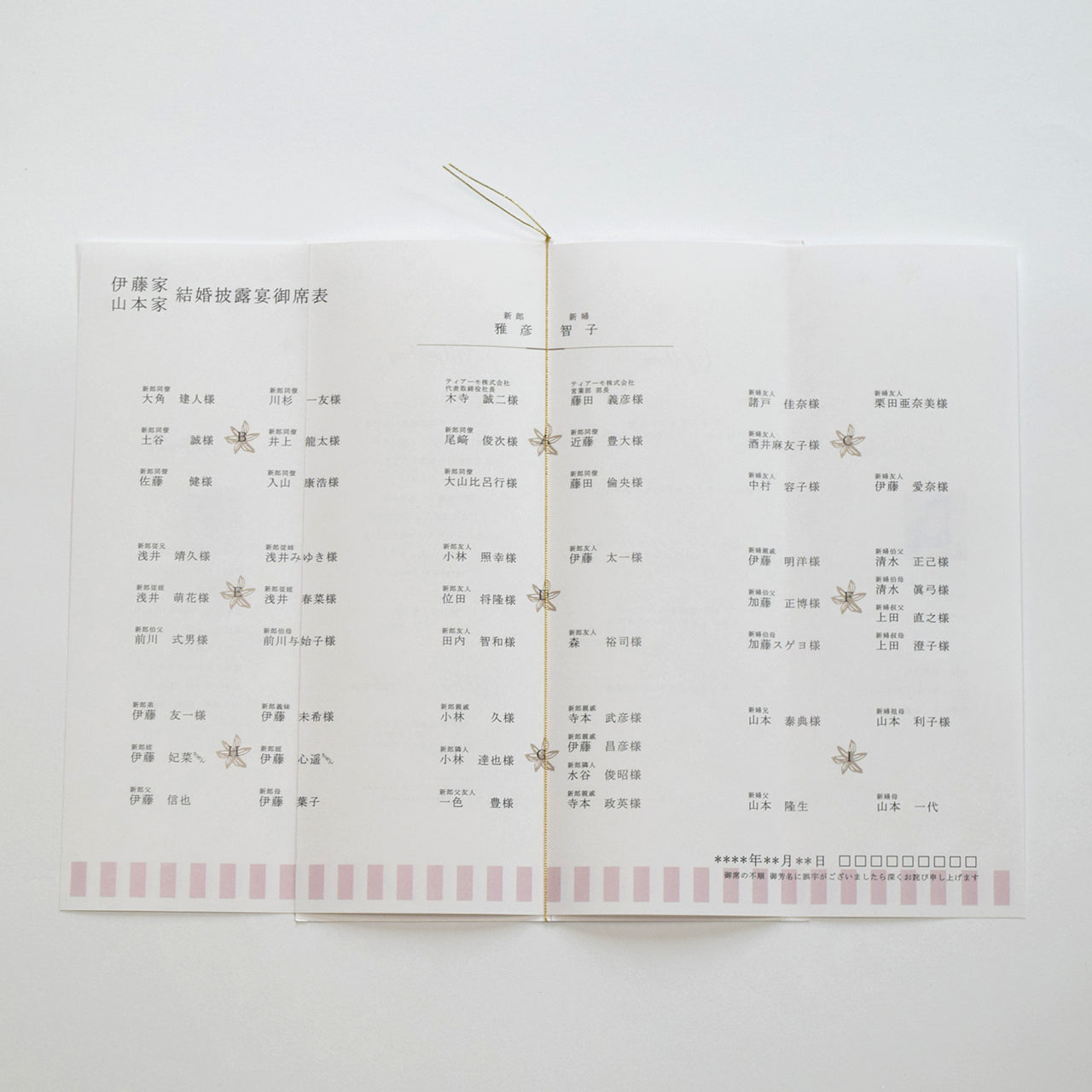 | 印刷備考 | 表面…席次表 裏面…挨拶・新居案内・メニュー・プロフィール(写真有) |