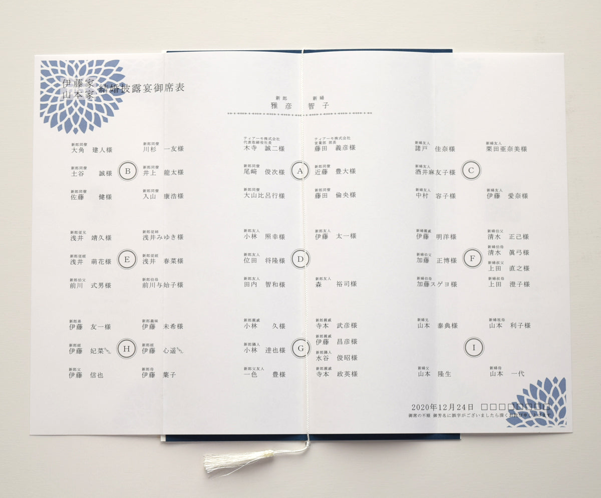 | 印刷備考 | 表面…席次表 裏面…挨拶・新居案内・メニュー・プロフィール(写真有) |
