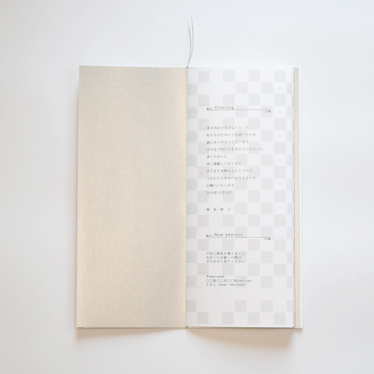 | 印刷備考 | 表面…席次表 裏面…挨拶・新居案内・メニュー・プロフィール(写真有) |
