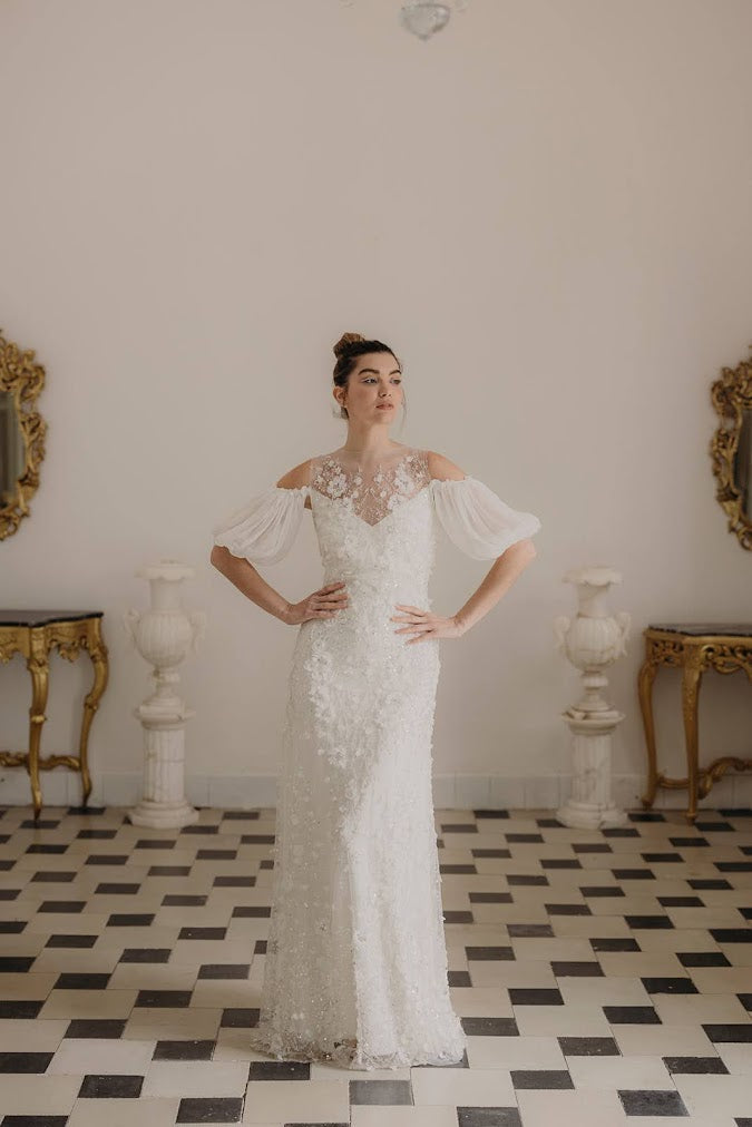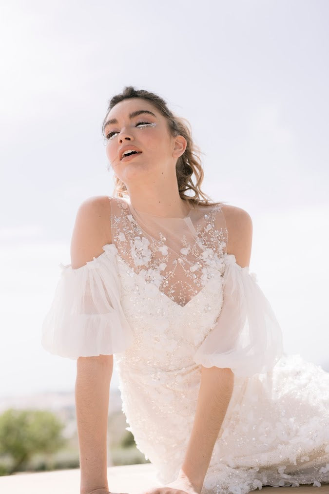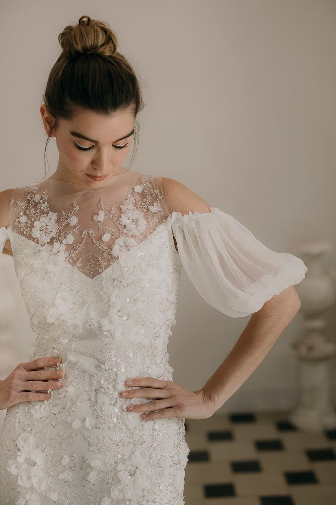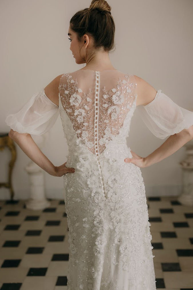 シフォンのパフスリーブはドロップショルダーになっており、肩のラインを美しく見せてくれます。