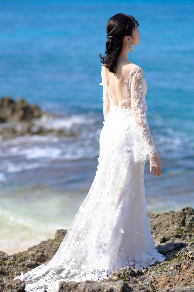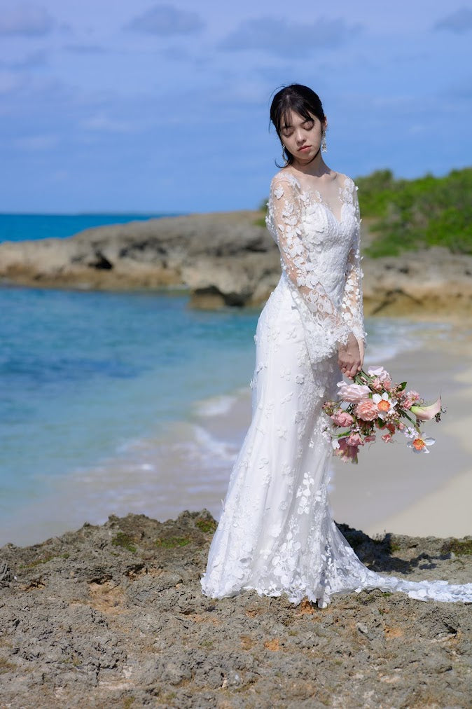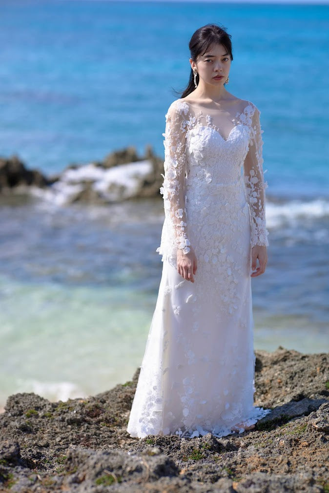 デコルテから袖口にかけてデザインされた、透明感のあるイリュージョンチュールに、立体的なボタニカルモチーフとスパンコールビージングが全体に散りばめられたウエディングドレス。