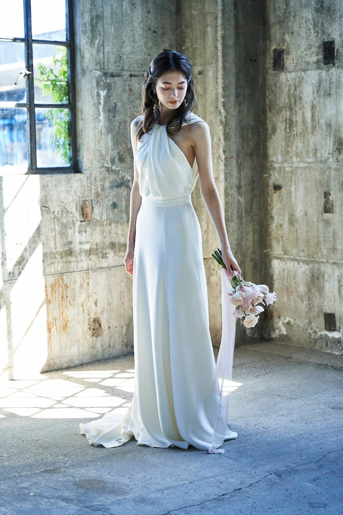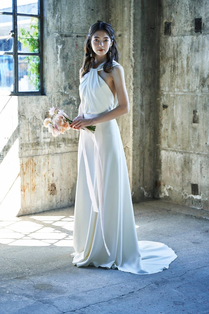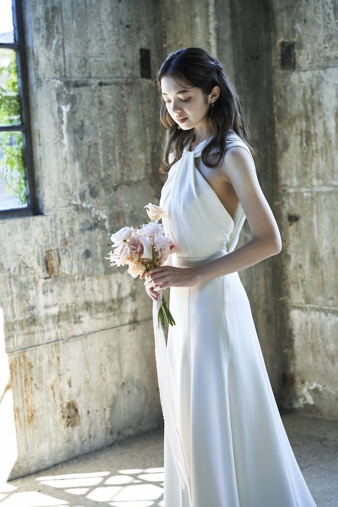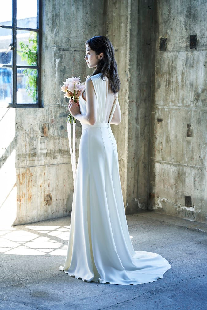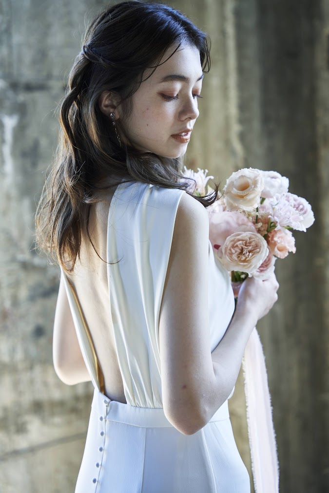 オープンバックにワイドストラップが洗練されたバックスタイルを演出し、腰元に連なるボタンと長さのあるトレーンがデザインへの拘りを感じさせます。